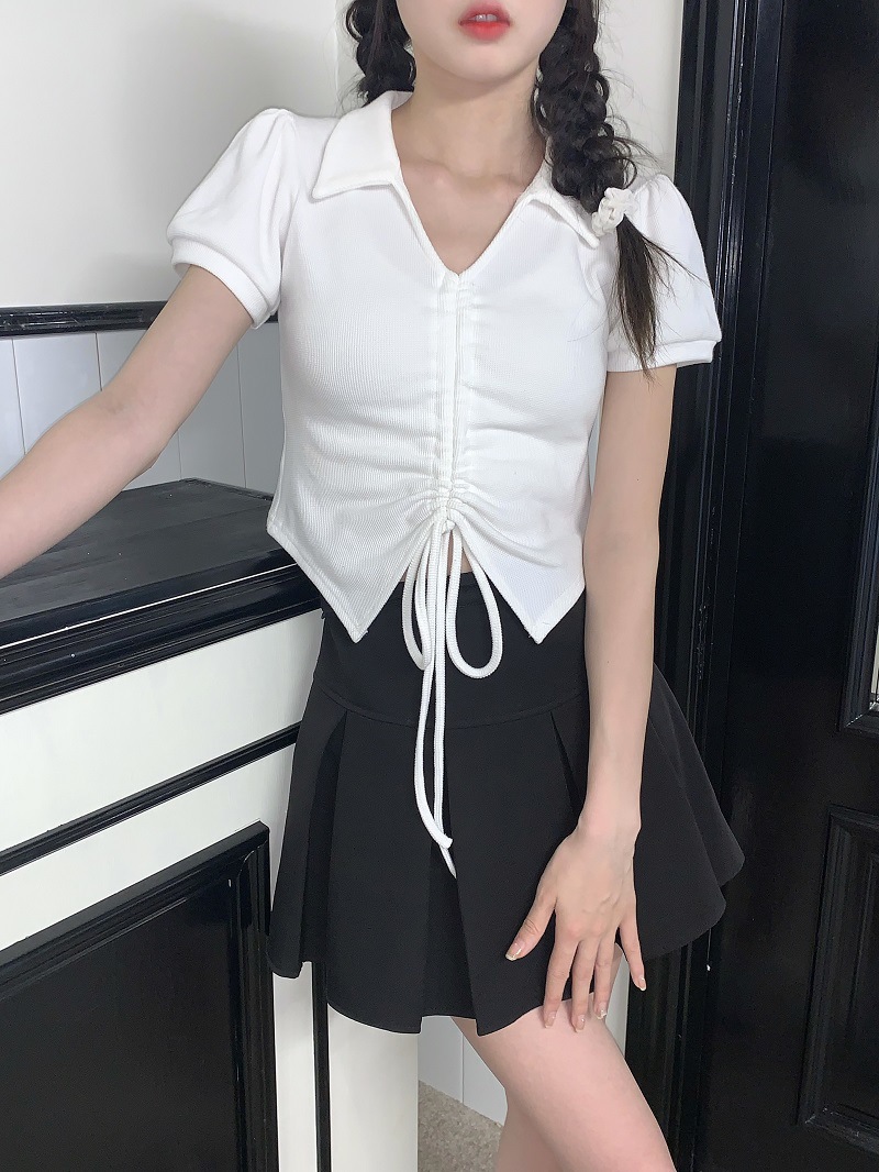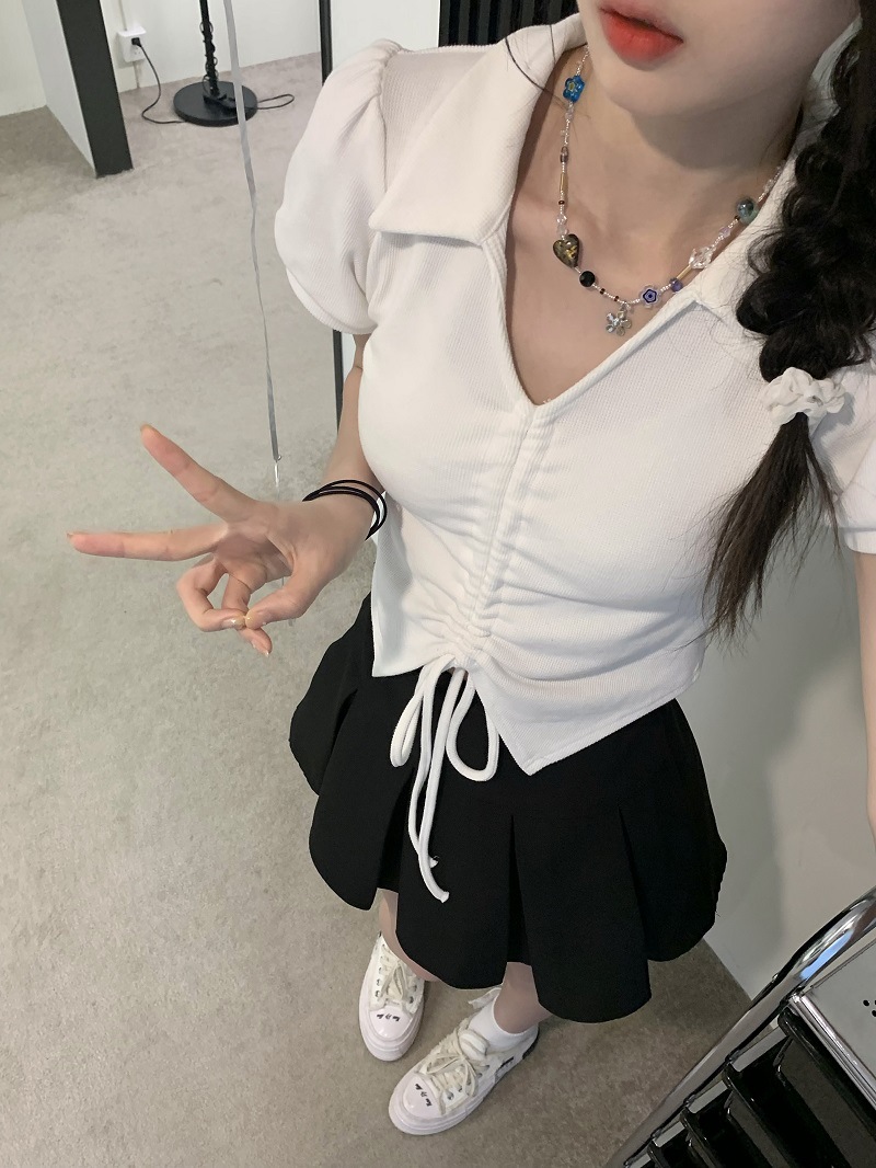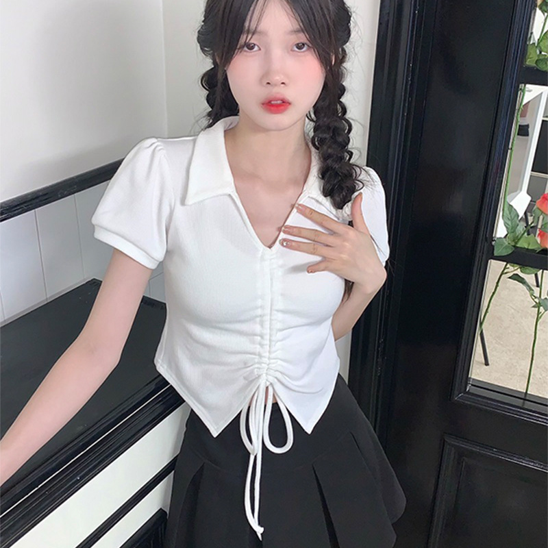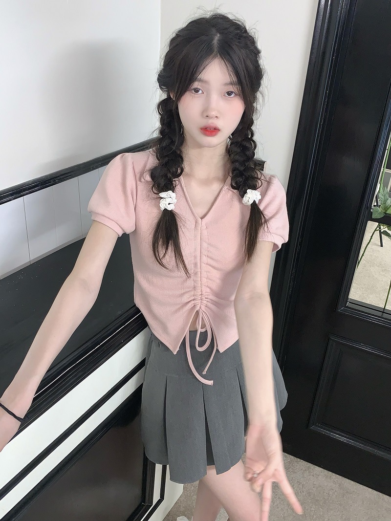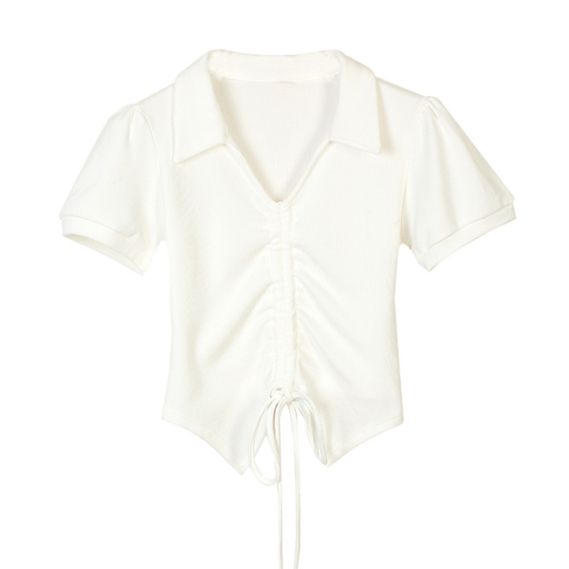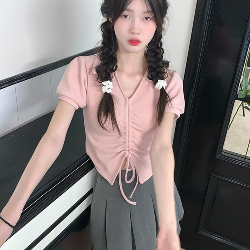 纯欲风甜辣显瘦短款上衣夏季设计感不规则抽绳V领泡泡短袖t恤女装