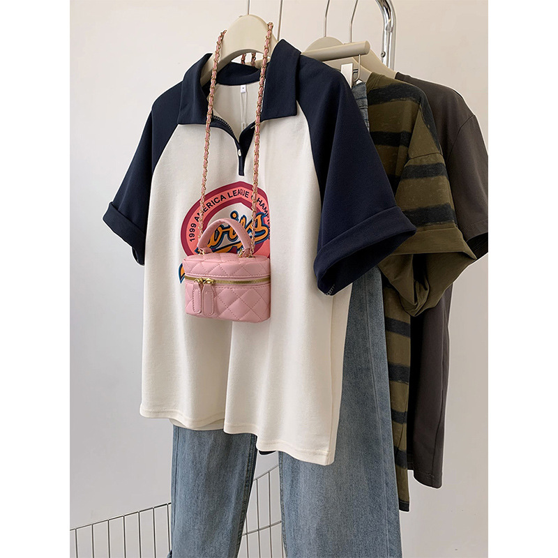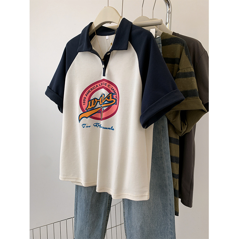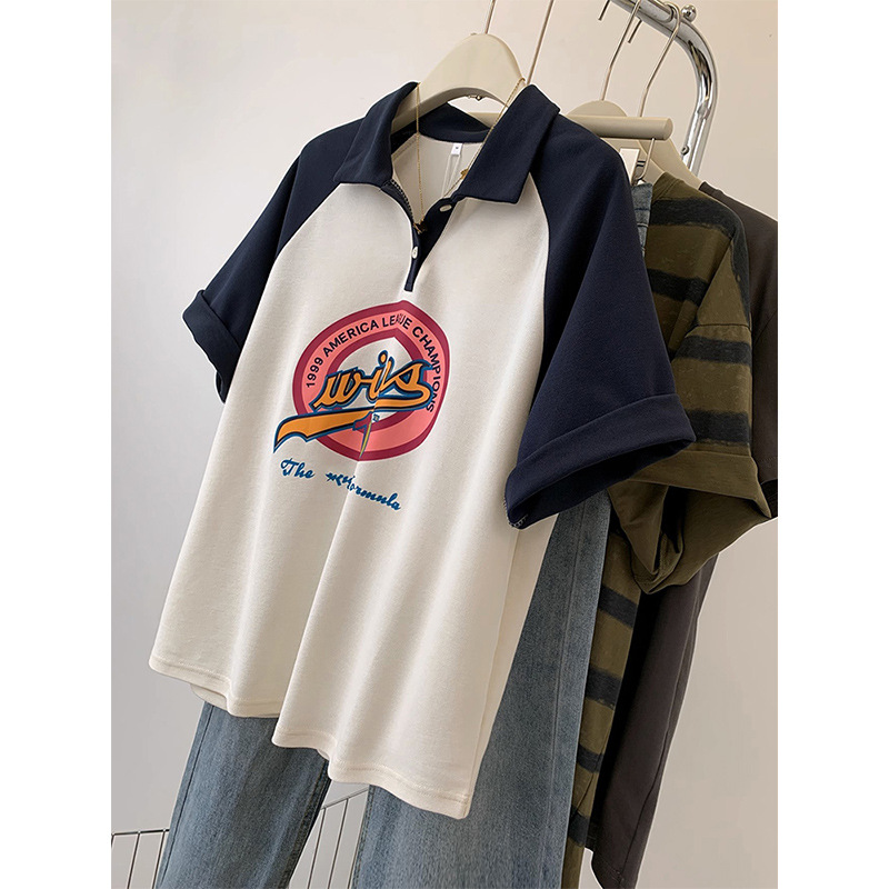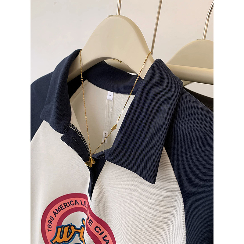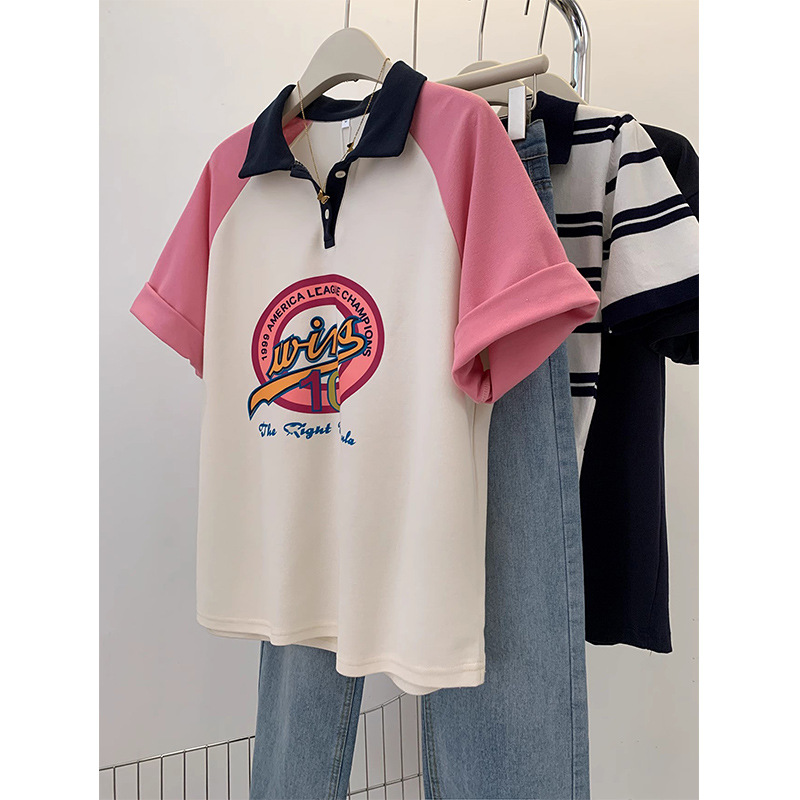 polo领撞色插肩短袖T恤女夏宽松中长款学院风设计感休闲半袖上衣