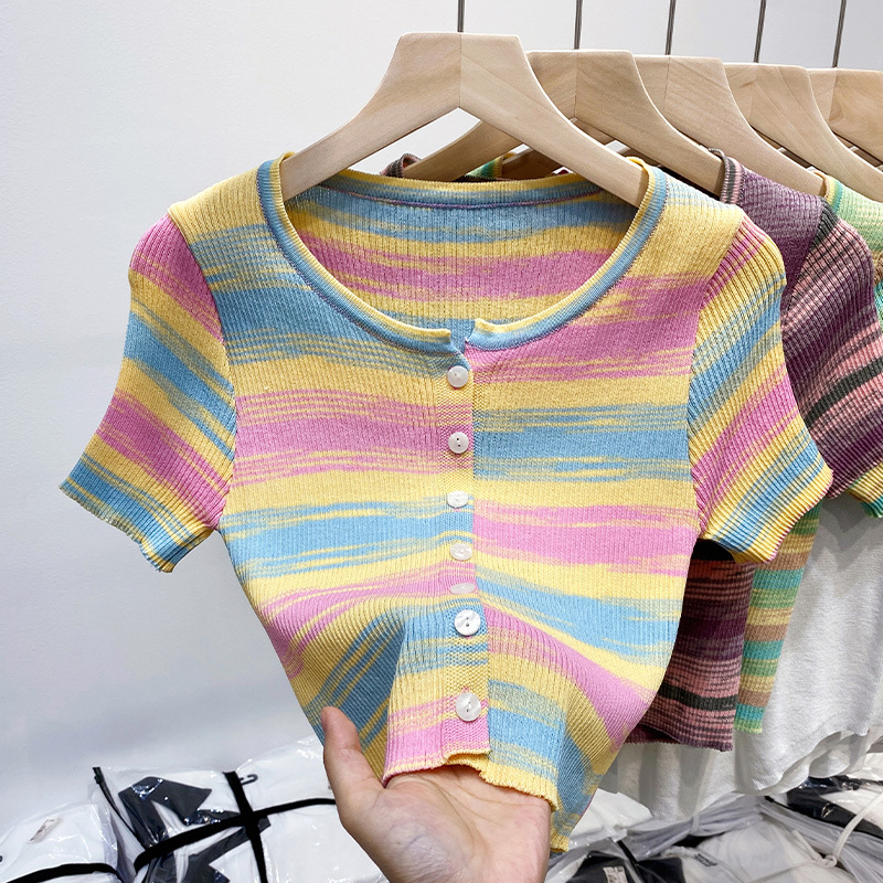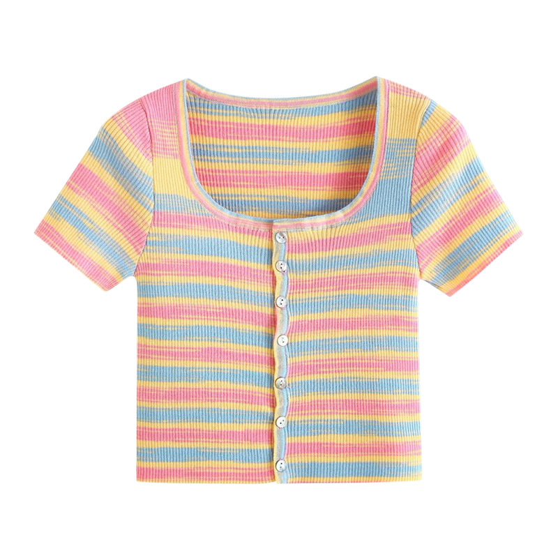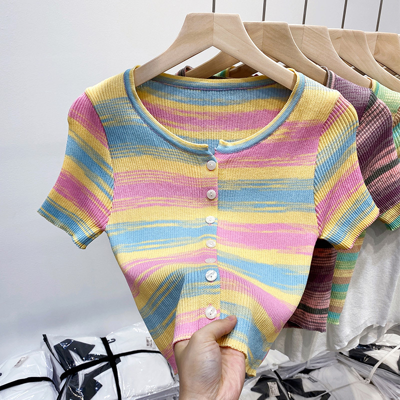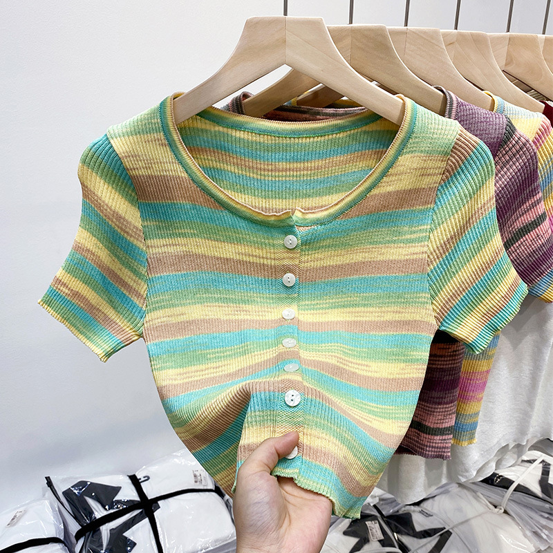 甜美减龄条纹正肩短袖t恤女夏日多巴胺穿搭修身短款针织开衫上衣