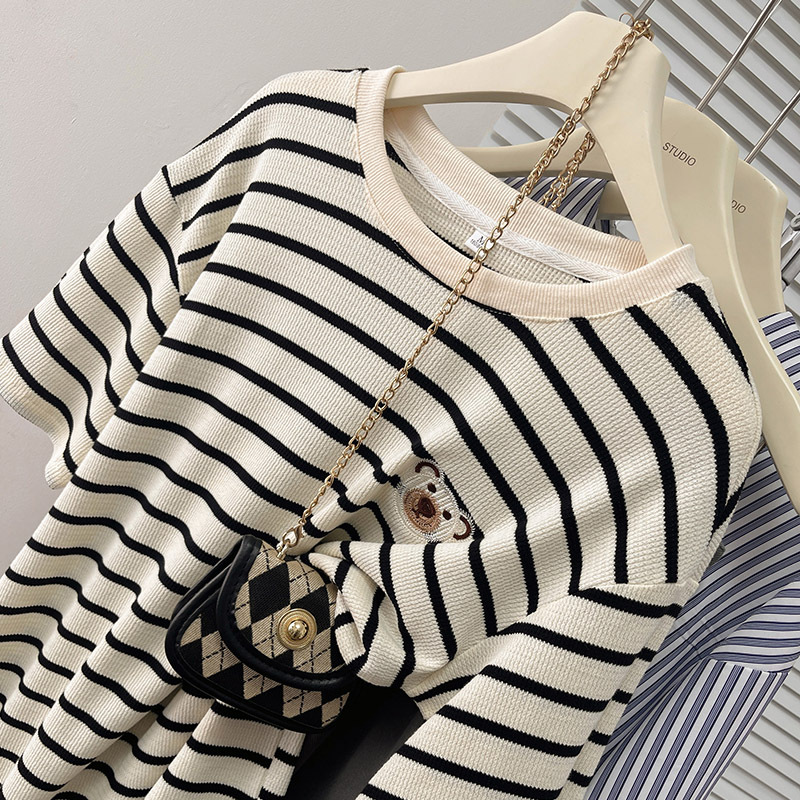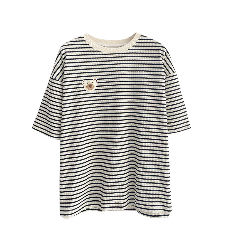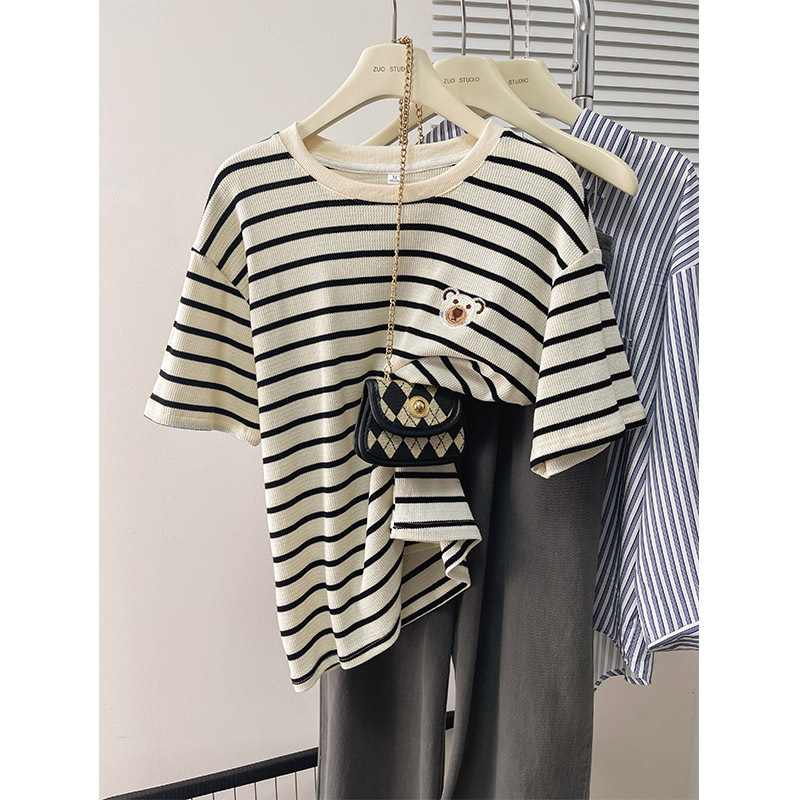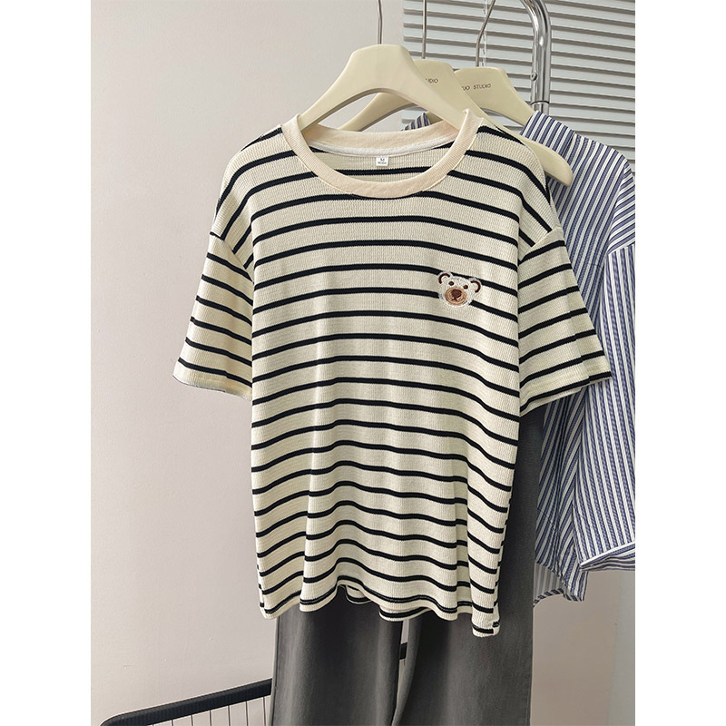 纯棉日系复古条纹刺绣短袖t恤女夏装ins慵懒洋气宽松半袖百搭上衣