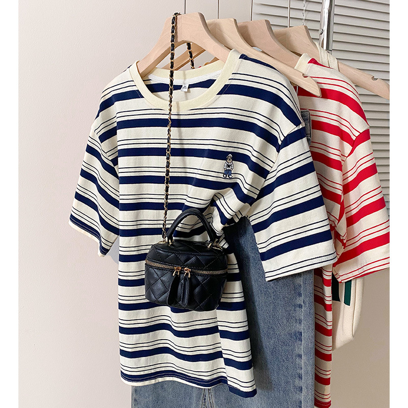纯棉撞色条纹短袖T恤女夏季韩版学生宽松显瘦休闲减龄半袖上衣服