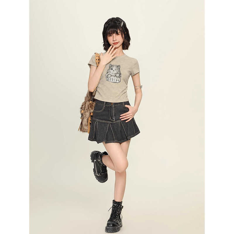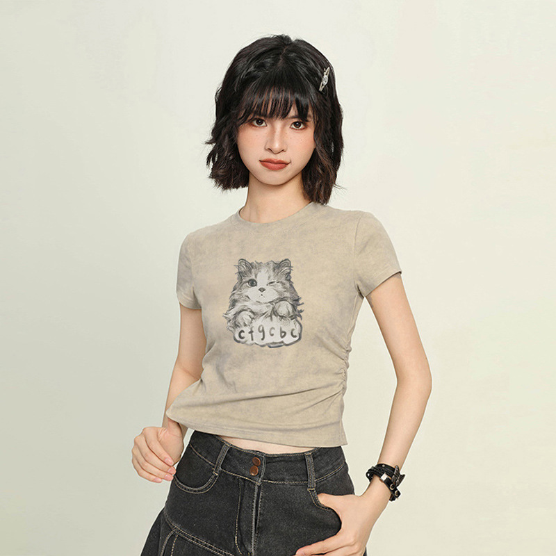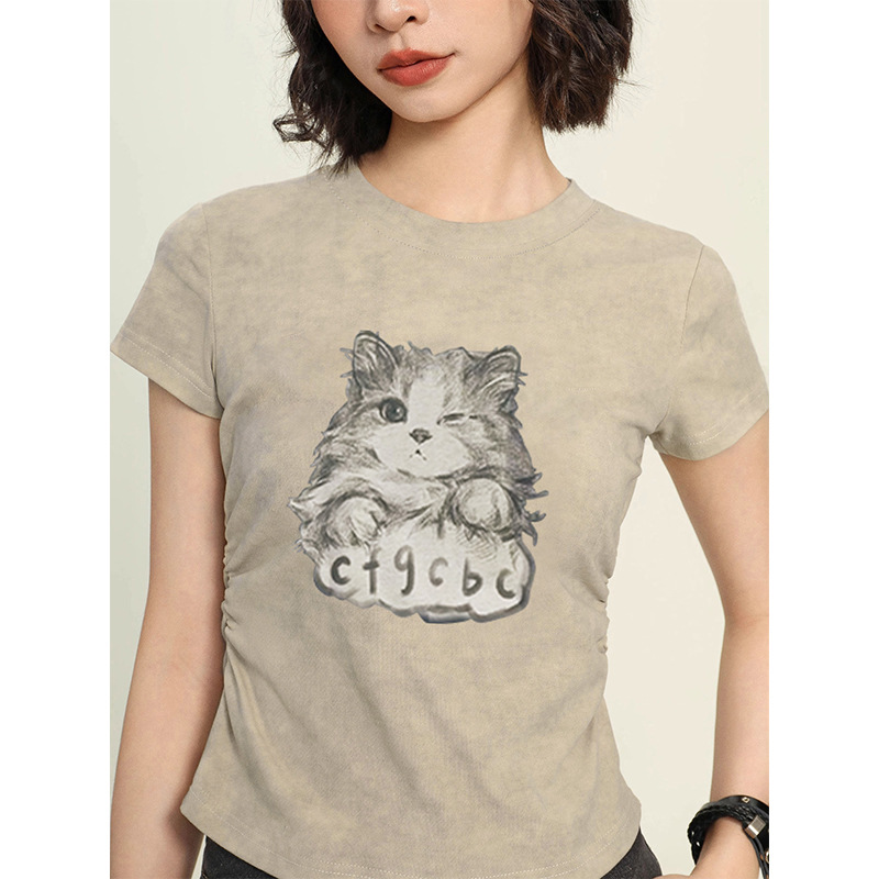 纯棉小猫正肩短款短袖t恤女夏季新款爆款小个子修身上衣夏装
