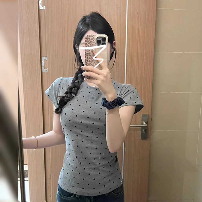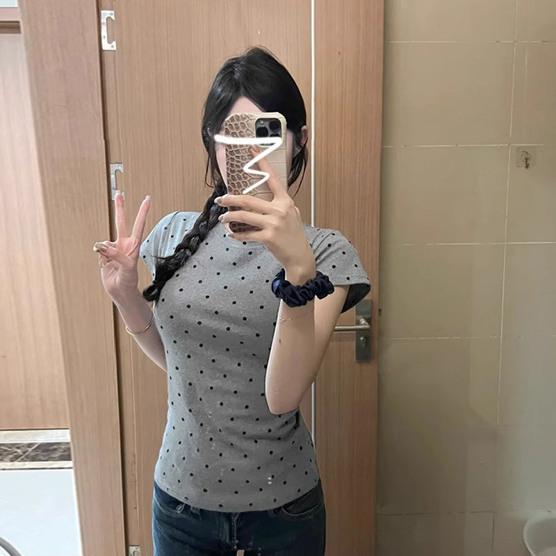 纯棉灰色波点正肩短袖t恤女夏季设计感小众法式修身短款紧身上衣