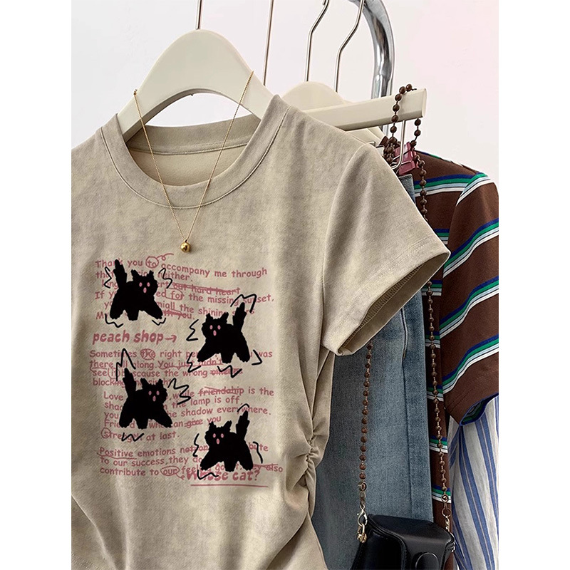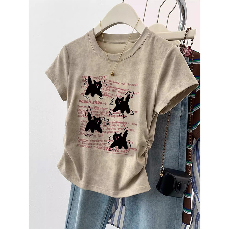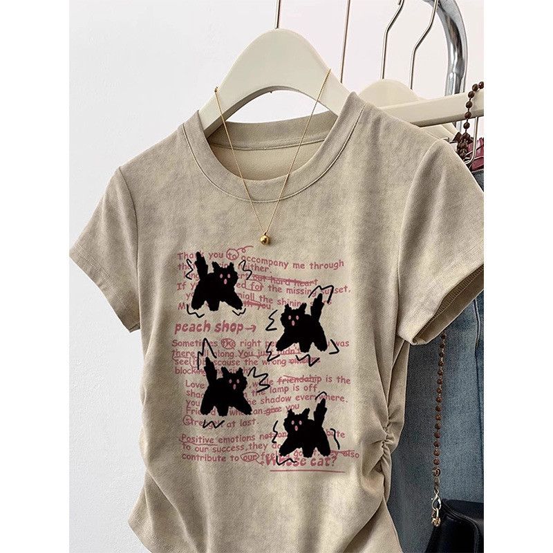 纯棉扎染猫咪印花正肩短袖t恤女夏季新款小个子短款修身上衣