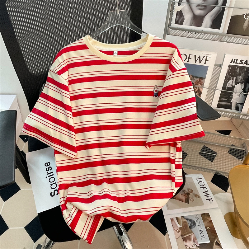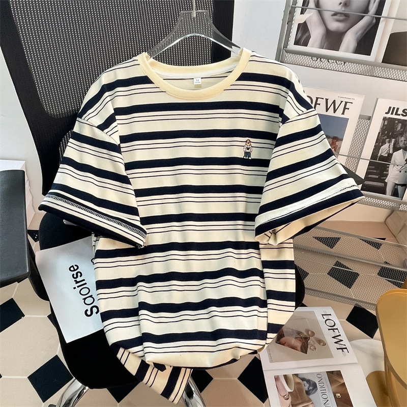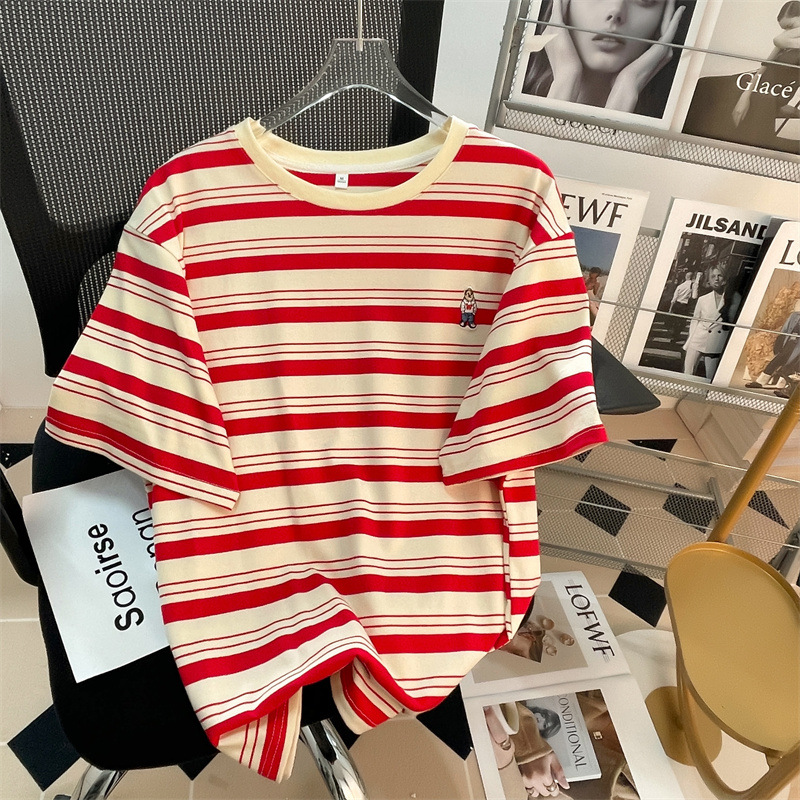 纯棉设计感卡通小熊刺绣短袖T恤女夏季小众休闲宽松条纹上衣体恤