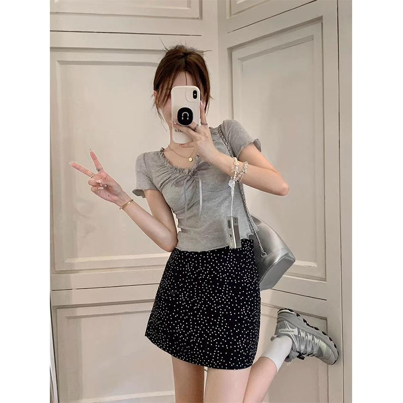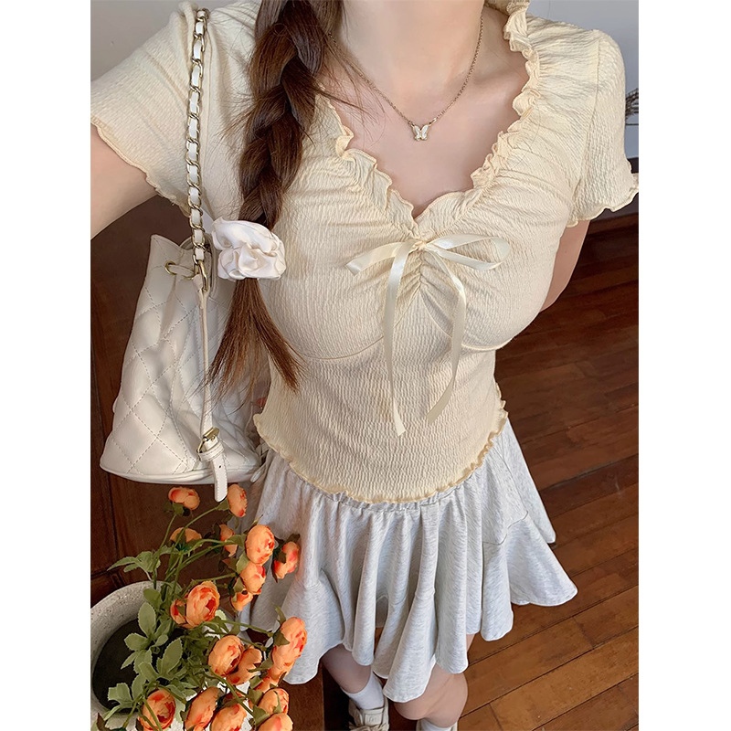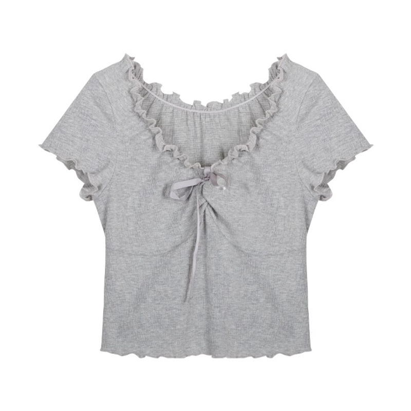 夏季v领修身显瘦木耳边正肩t恤女短袖芭蕾风甜辣短款小个子上衣服