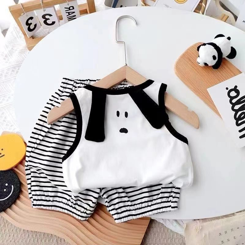 夏季男女童套装宝宝洋气儿童个性潮可爱韩版卡通背心条纹运动短裤