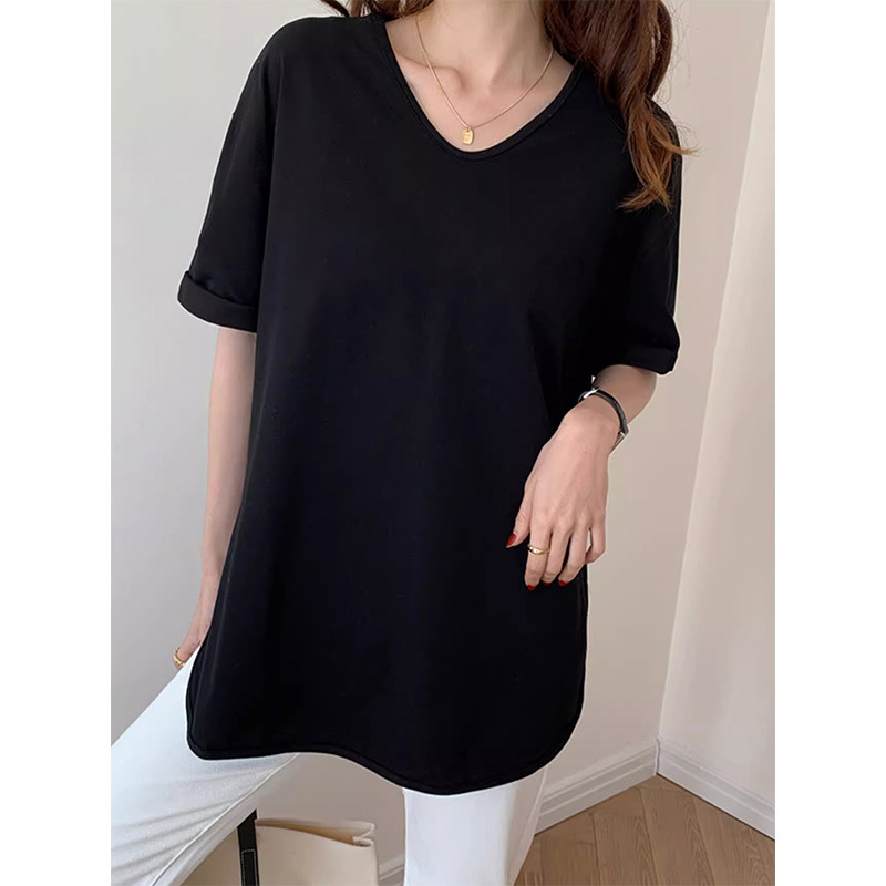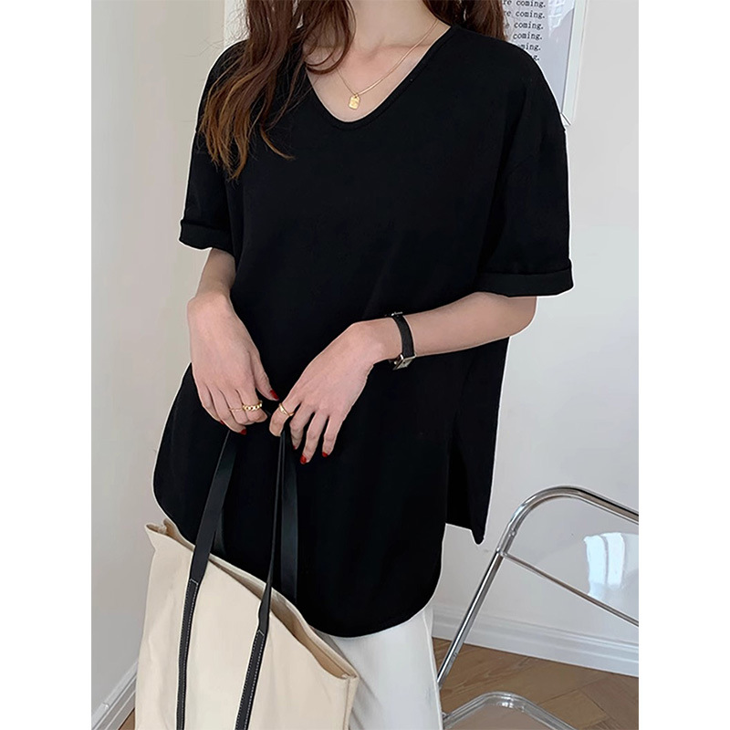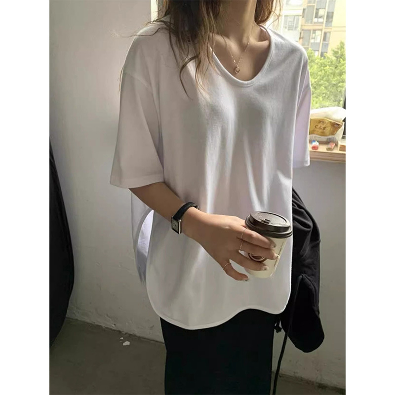 纯棉设计感小众显瘦短袖t恤女夏季开叉中长款宽松圆领上衣薄款