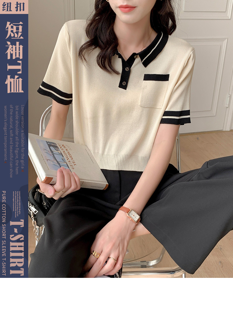 PLOLO领高腰短款针织短袖T恤女宽松学院风设计感小众夏季拼接上衣