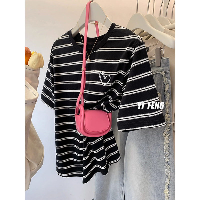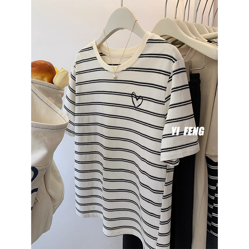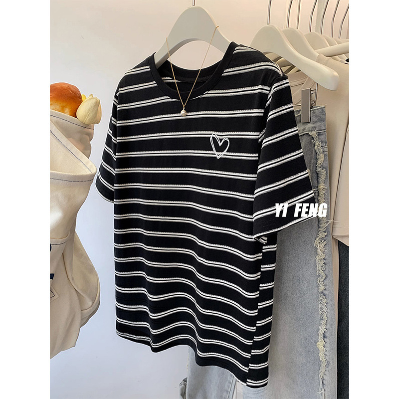 条纹爱心正肩短袖T恤女新款夏显瘦设计感小众宽松体恤上衣服
