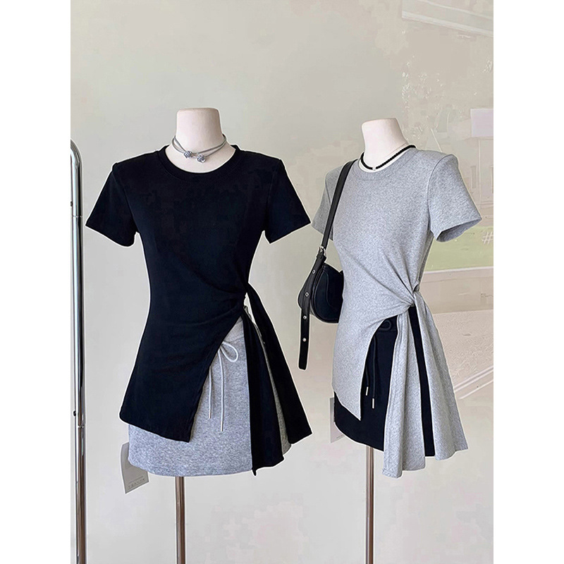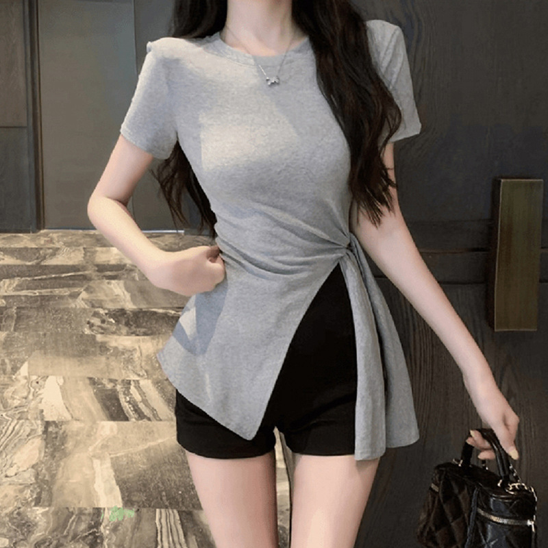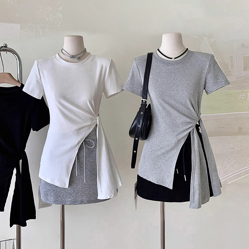 纯棉圆领正肩短袖T恤女夏季独特别致修身显瘦辣妹开叉中长款上衣