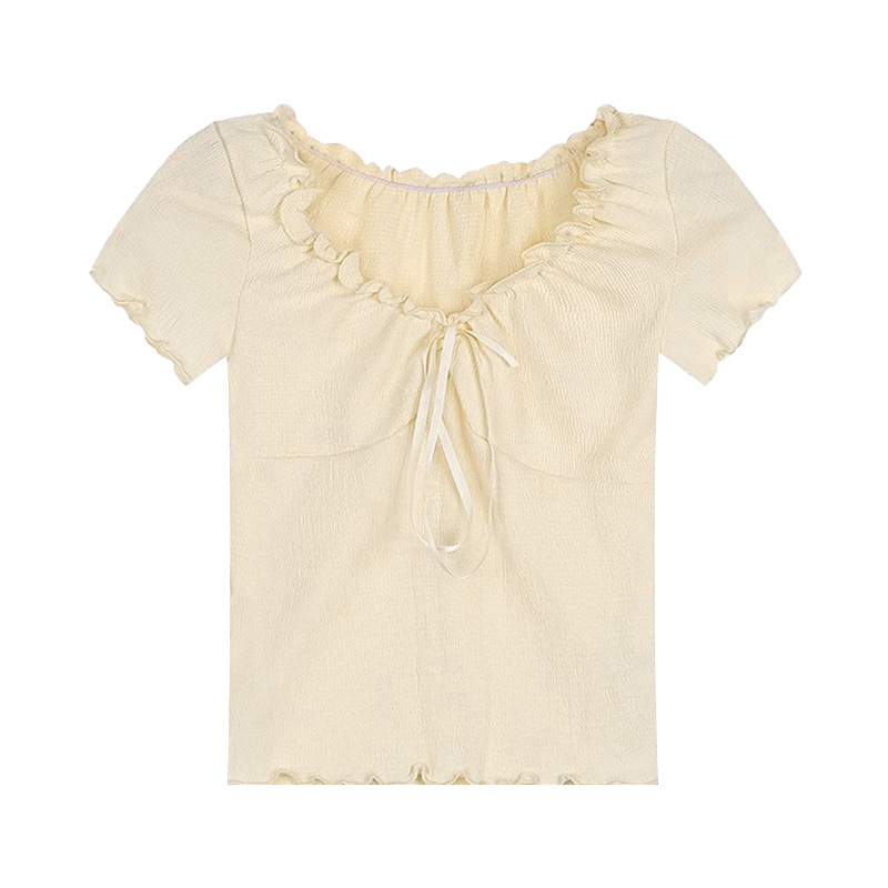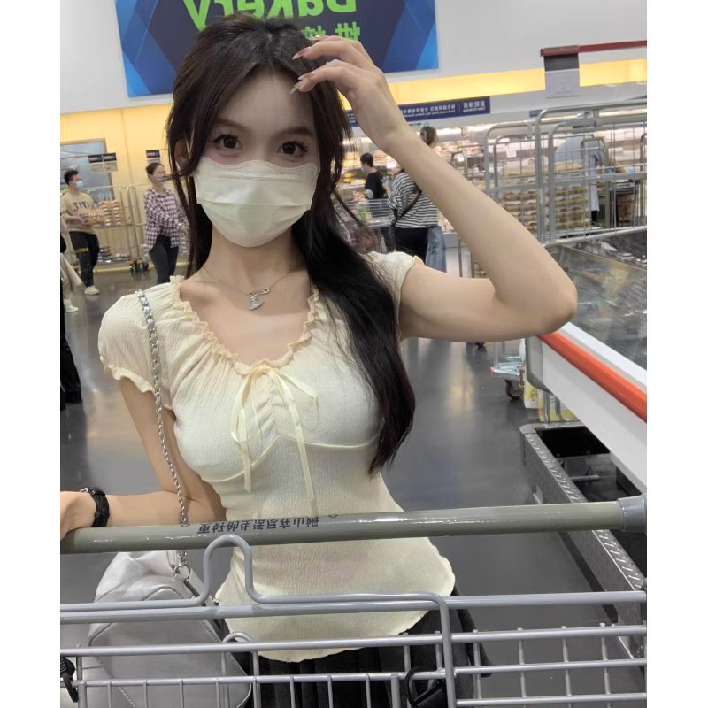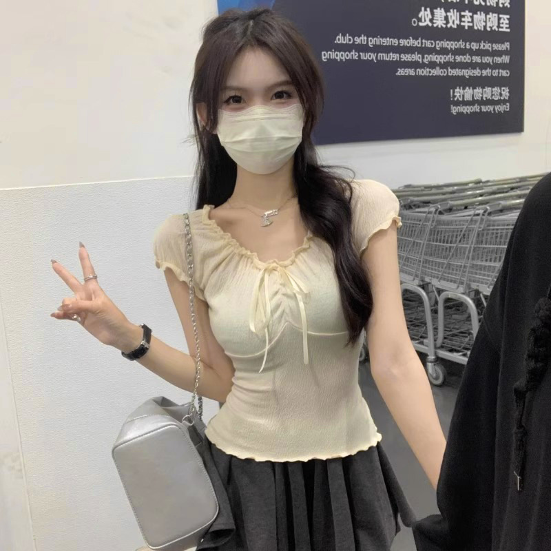 V领花边芭蕾风T恤女夏季新款抽绳设计感小众半袖显瘦短款纯欲上衣