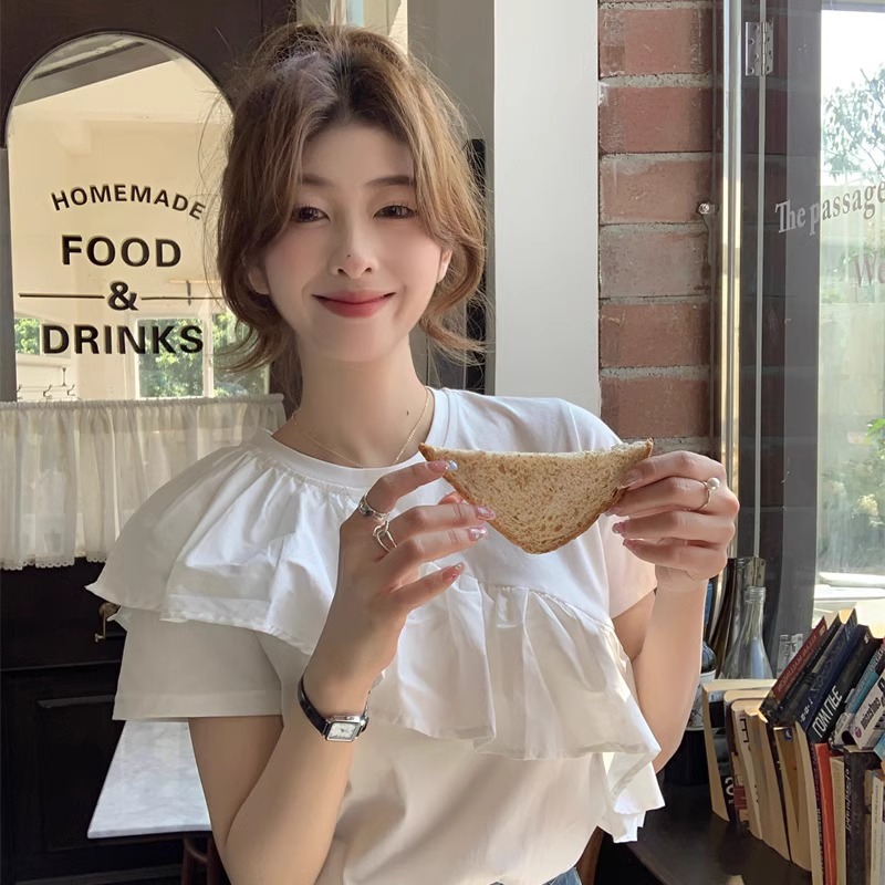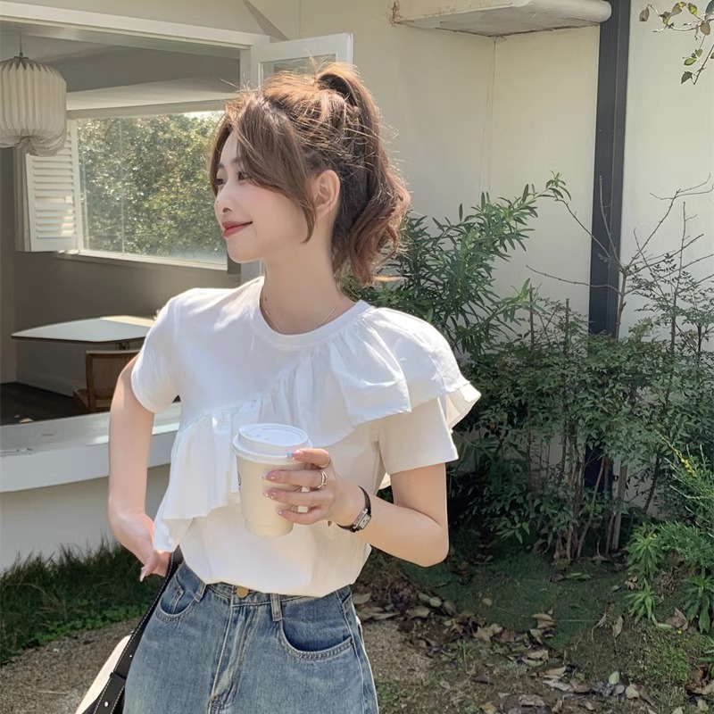 白色正肩t恤女设计感小众夏季年新款荷叶边短袖纯棉上衣ins潮