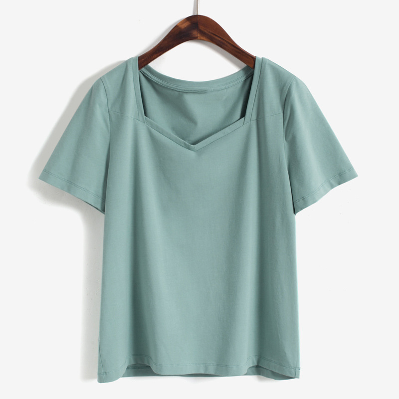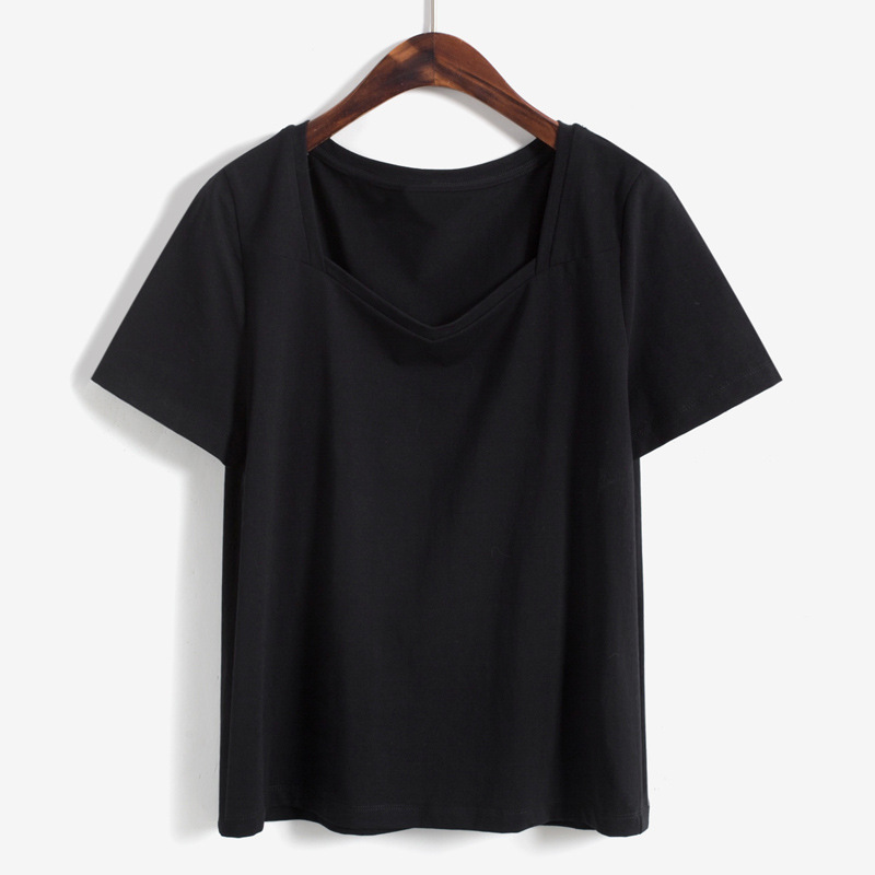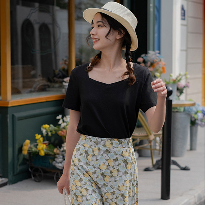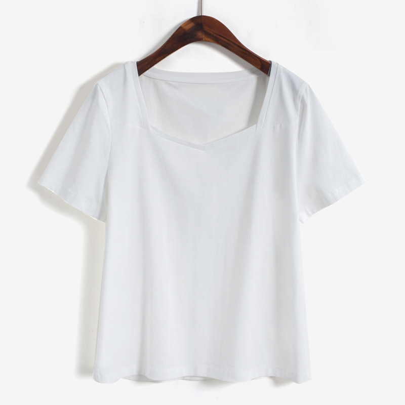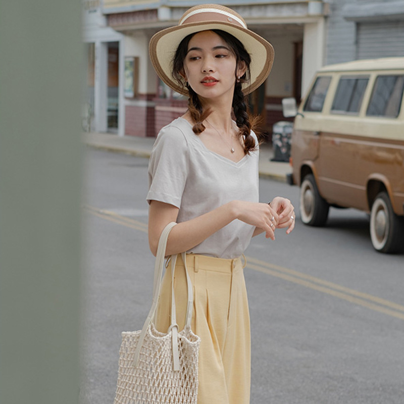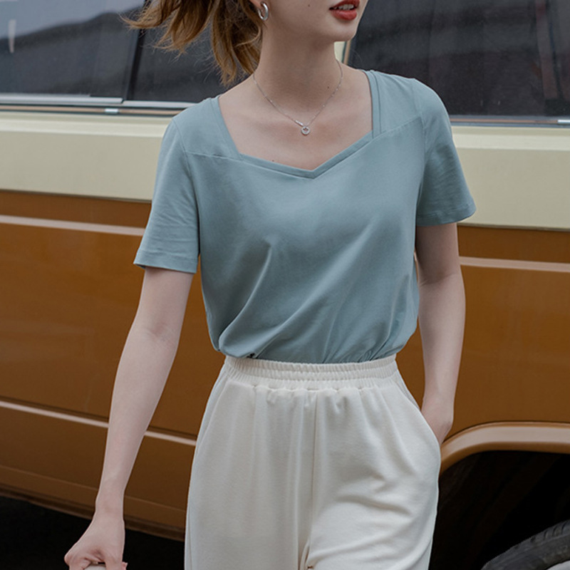 方领短袖t恤女夏季新款宽松设计感v领正肩纯棉露锁骨法式上衣ins