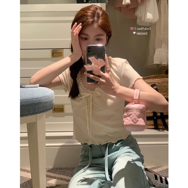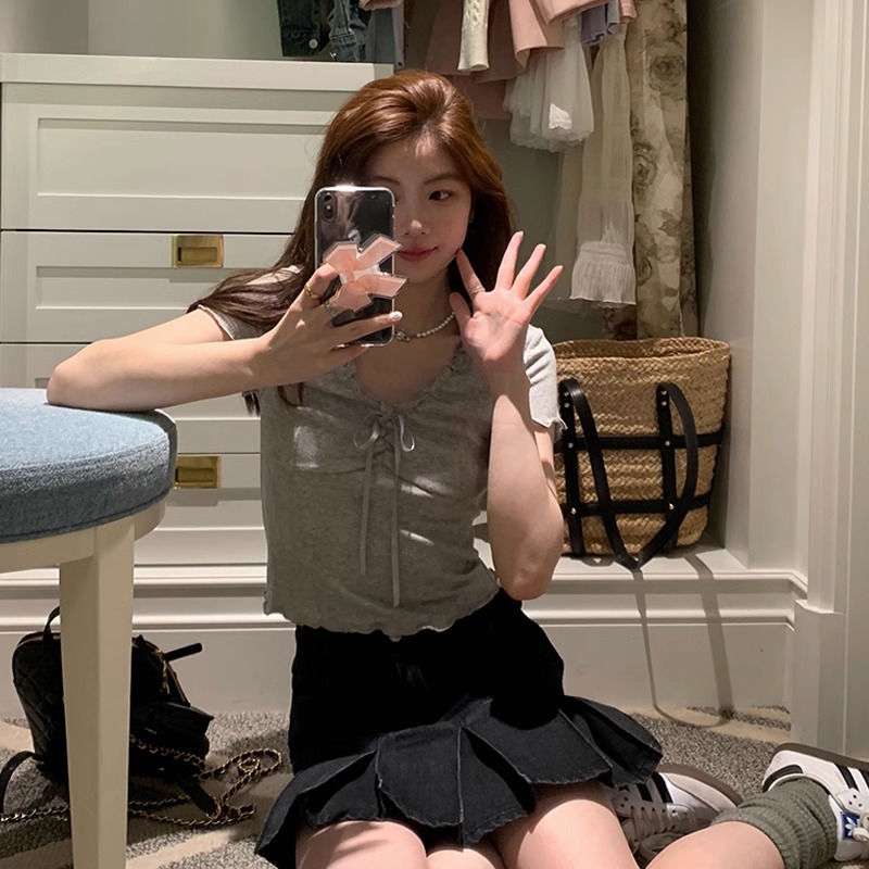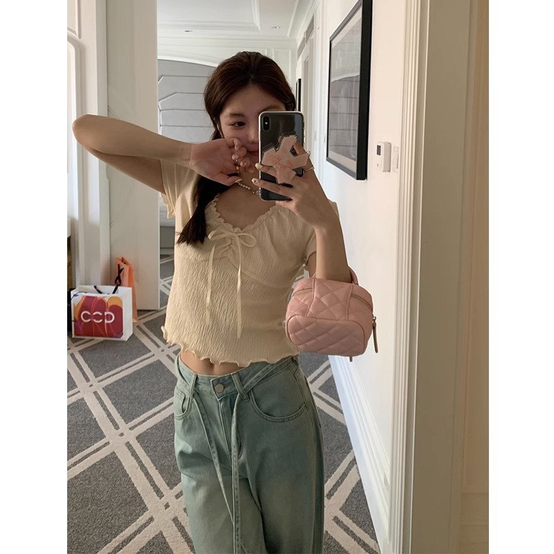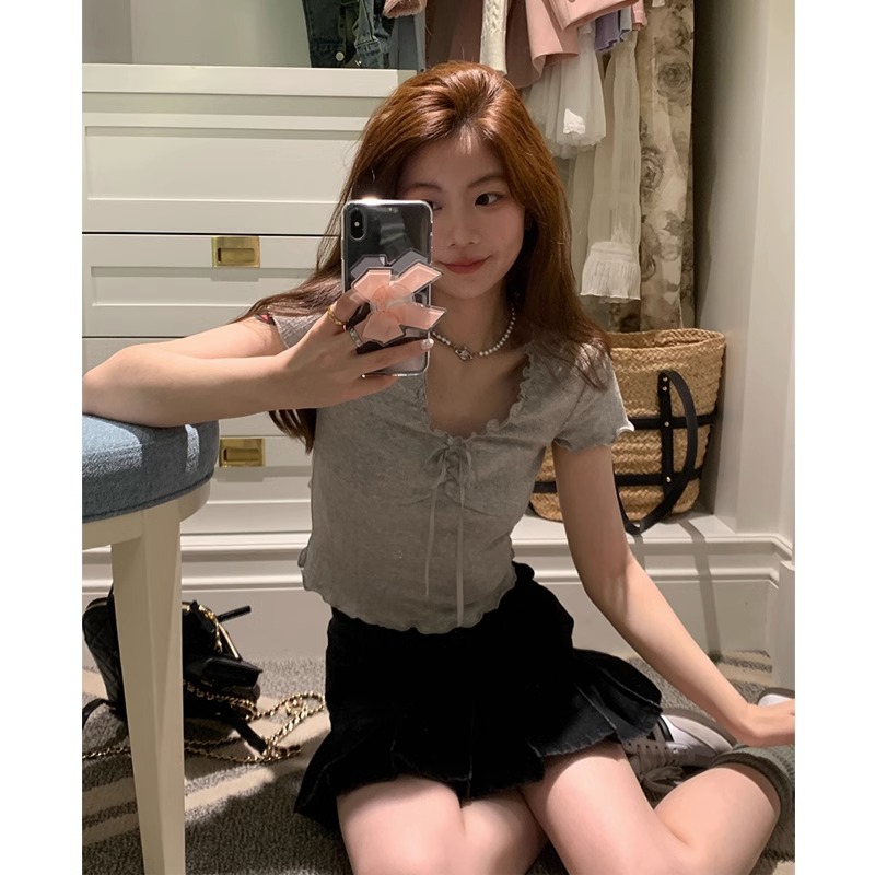 正肩设计感纯欲芭蕾风短袖T恤女夏季V领木耳边修身显瘦短款上衣服