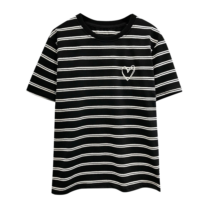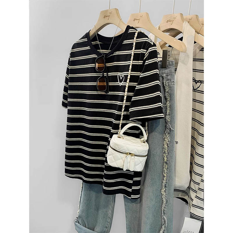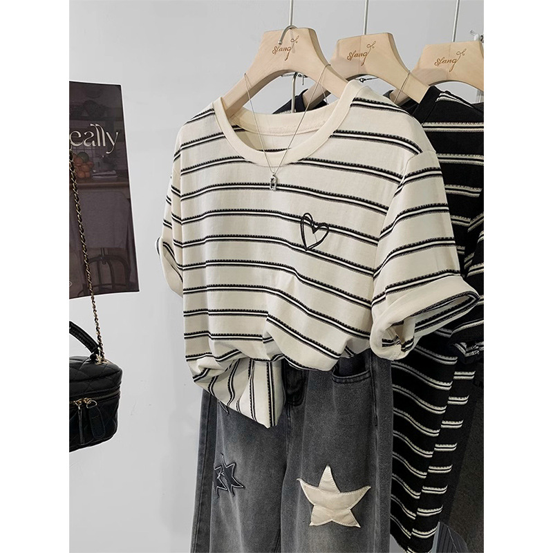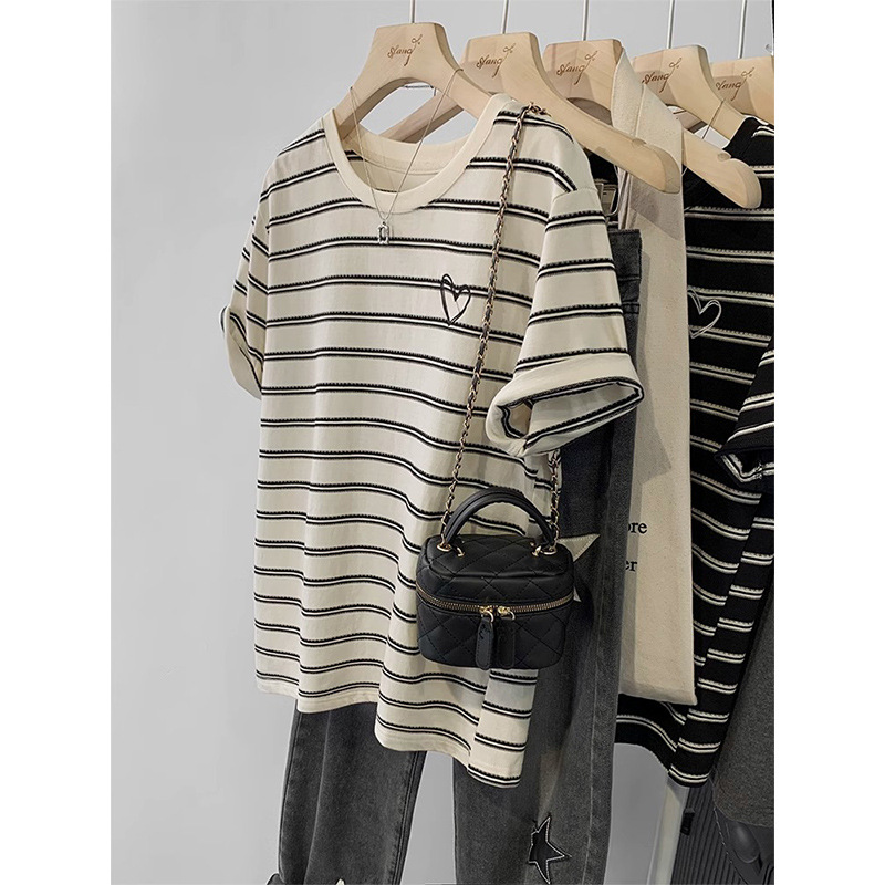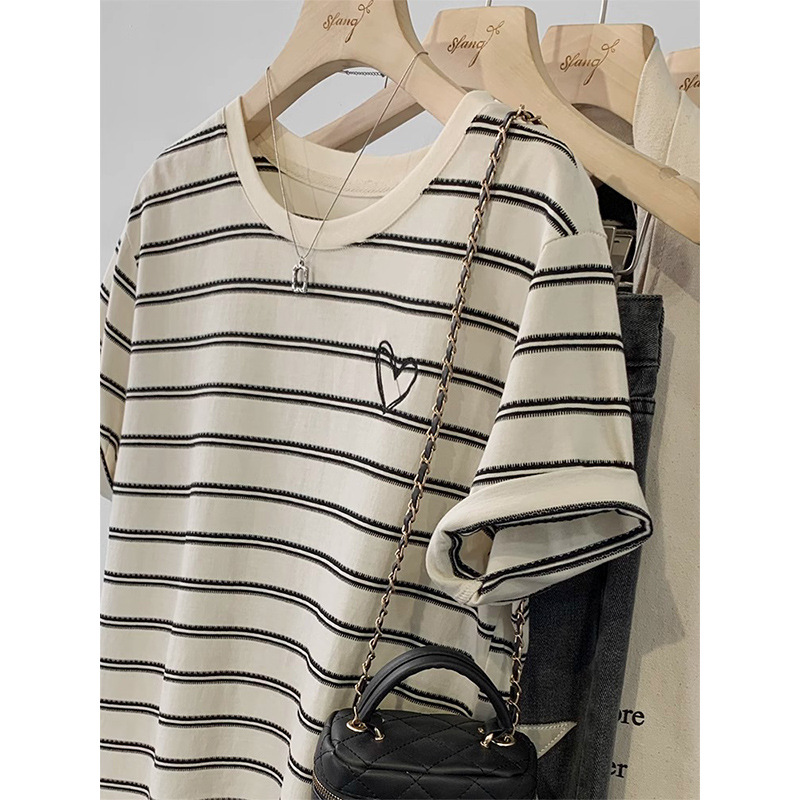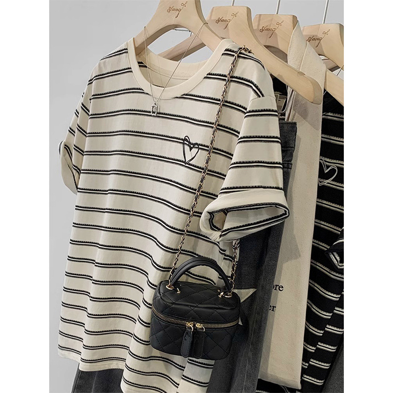 撞色条纹短袖T恤女新款夏季宽松显瘦美式复古休闲刺绣上衣潮