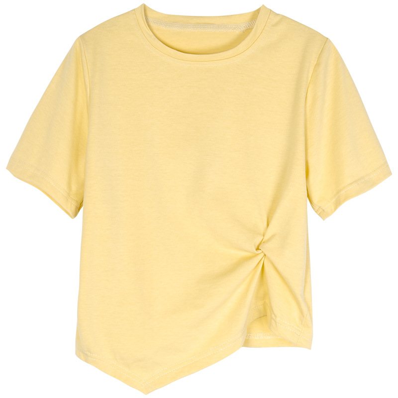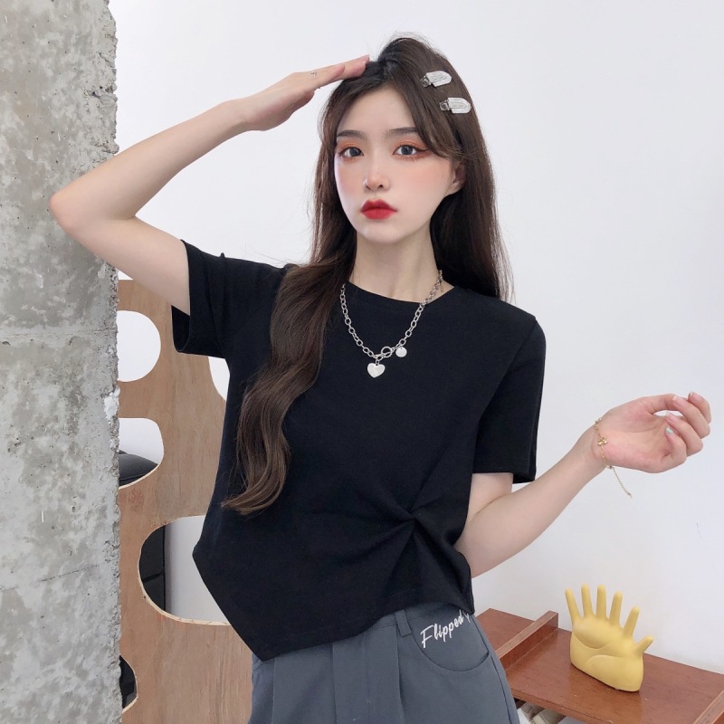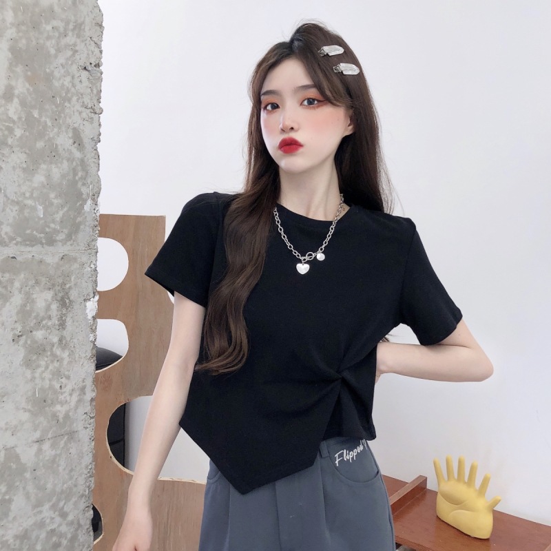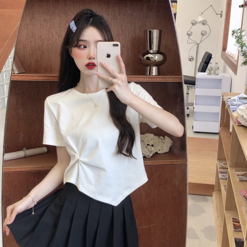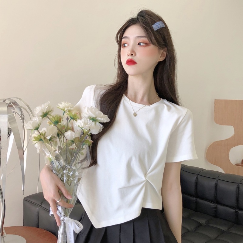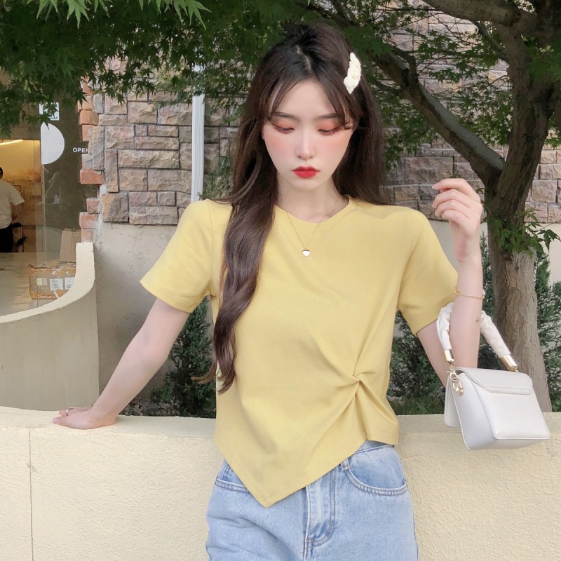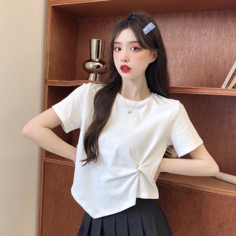 纯棉正肩短袖t恤女夏新款修身不规则短款上衣设计感小众半袖体桖