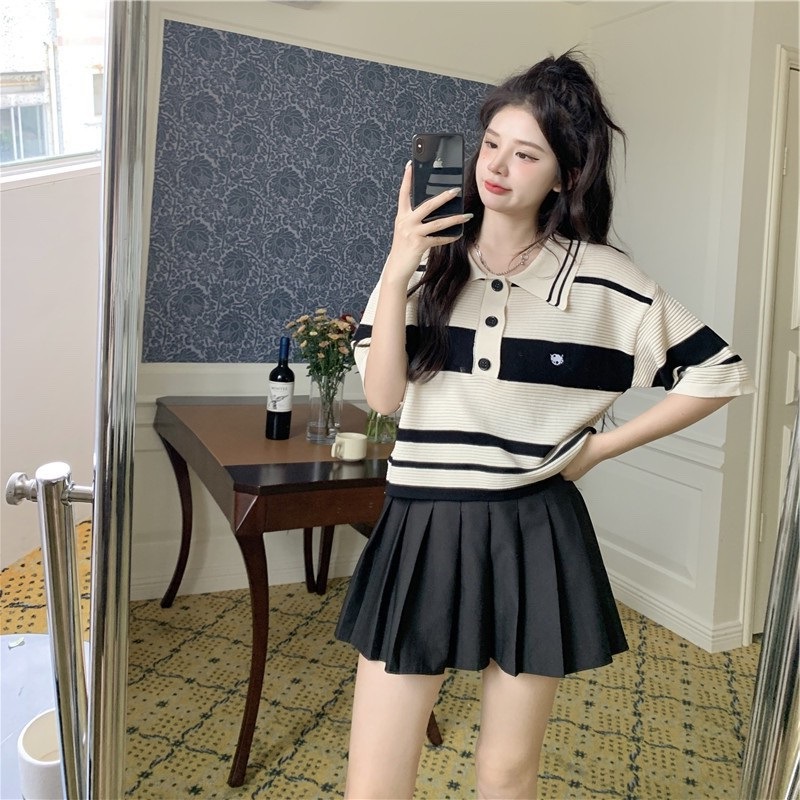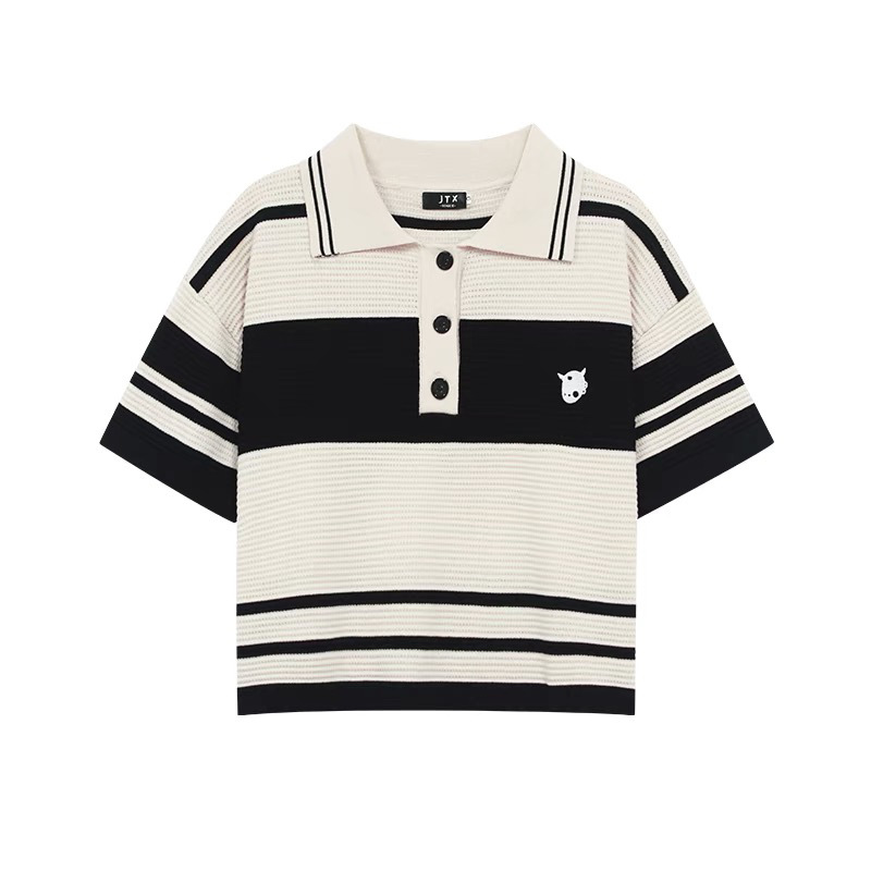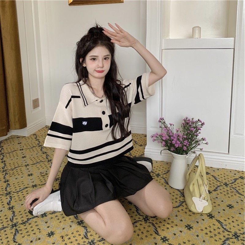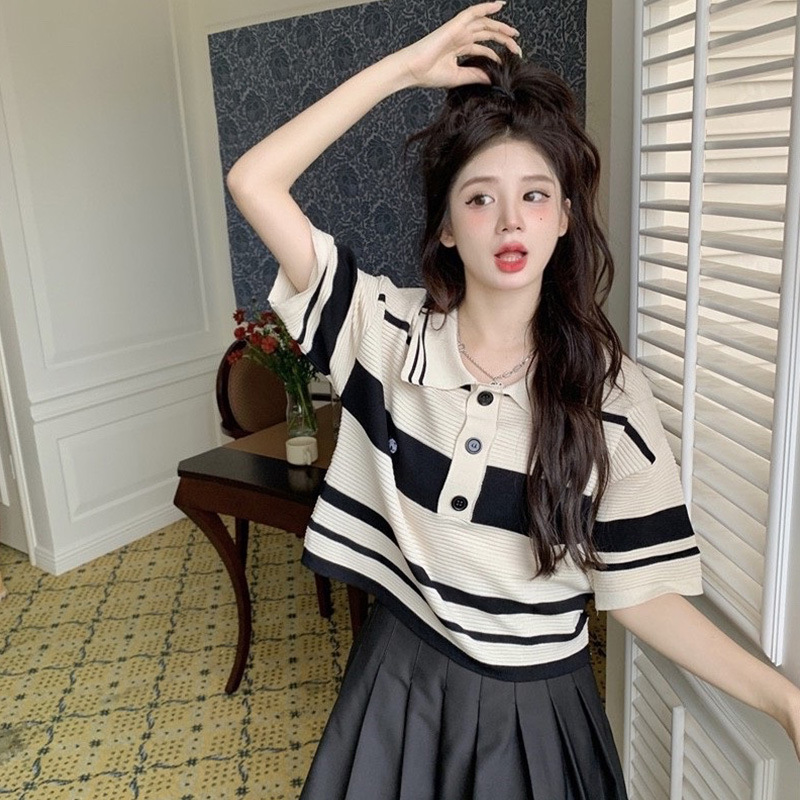 针织polo衫T恤女夏新款设计感小众条纹正肩显瘦独特别致小衫上衣