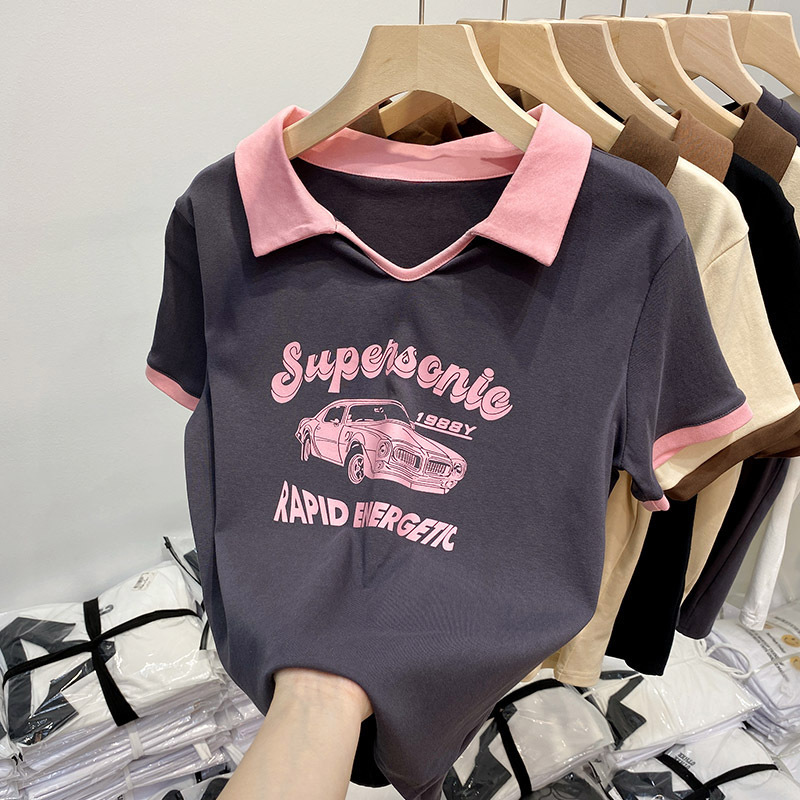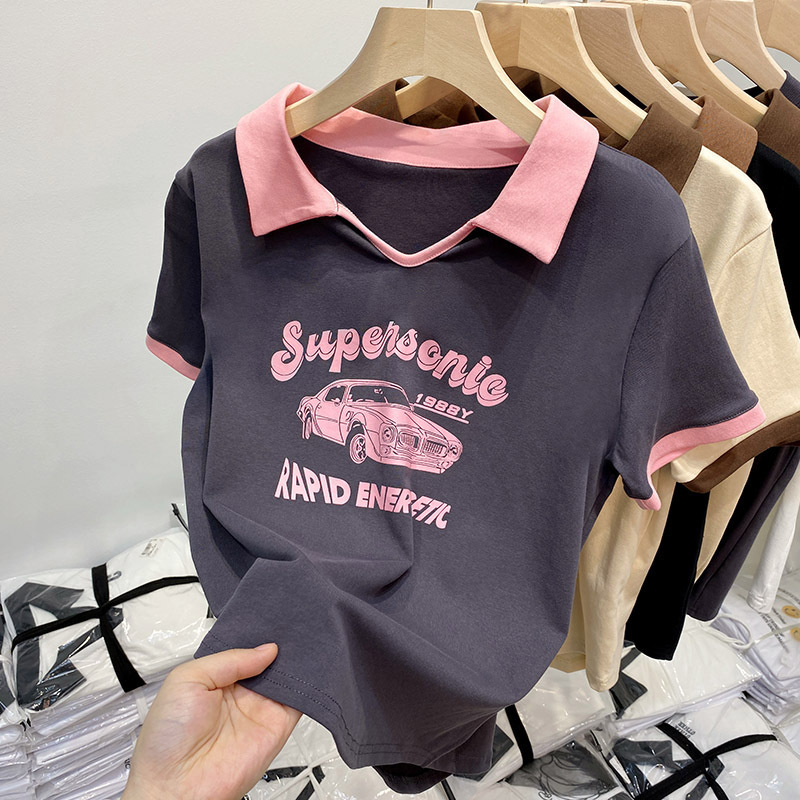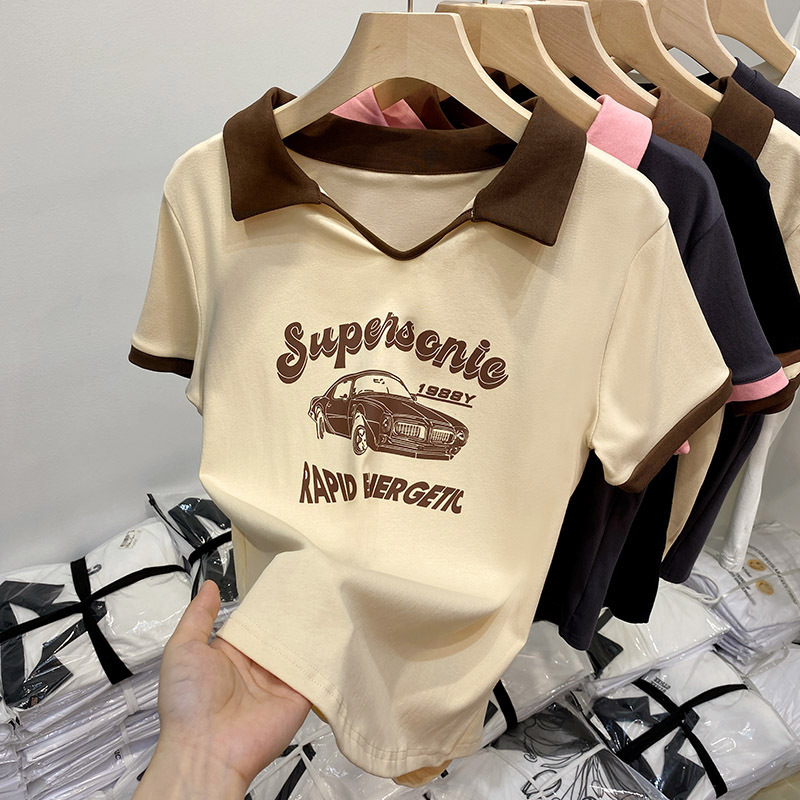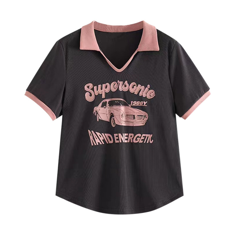 纯棉正肩Polo领短袖T恤女士夏季美式复古v领撞色不规则小众上衣