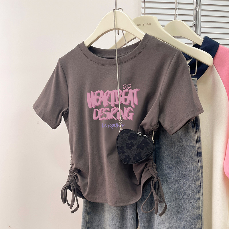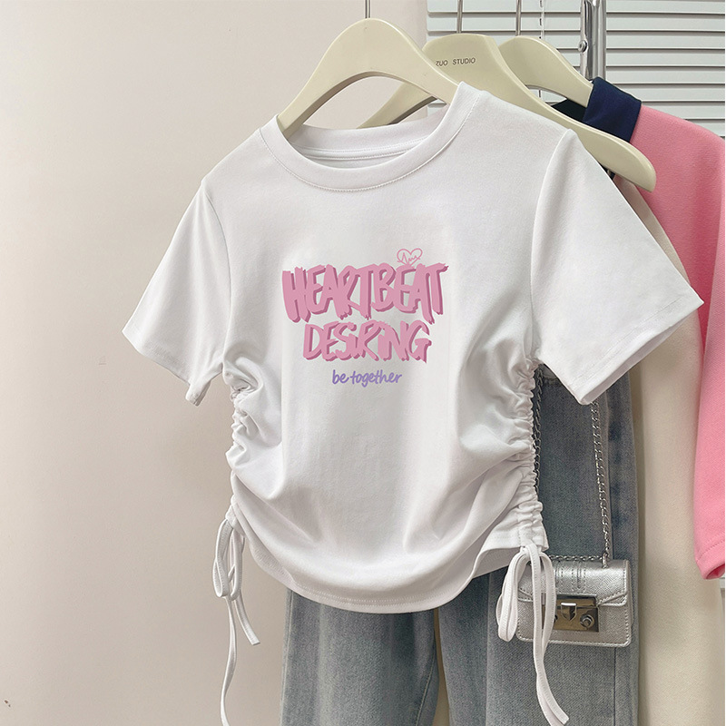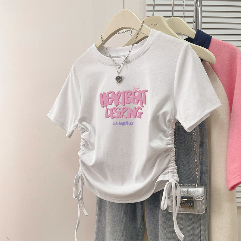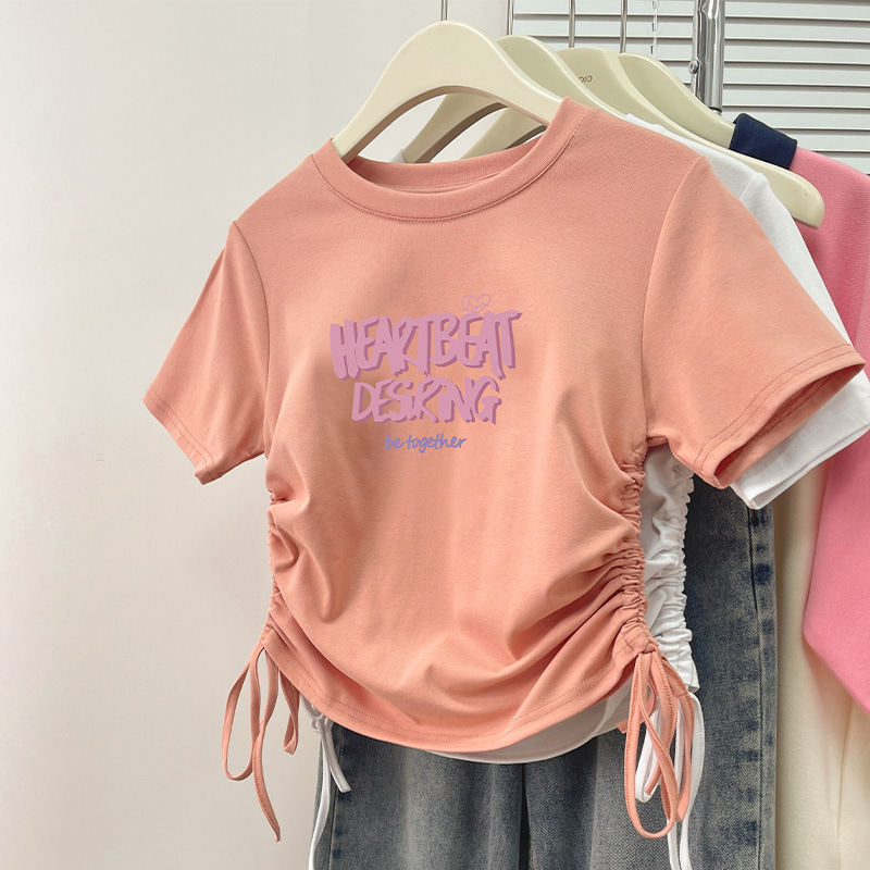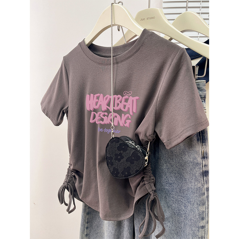 纯棉正肩甜辣短袖T恤女夏季设计感小众修身显瘦抽绳收腰短款上衣