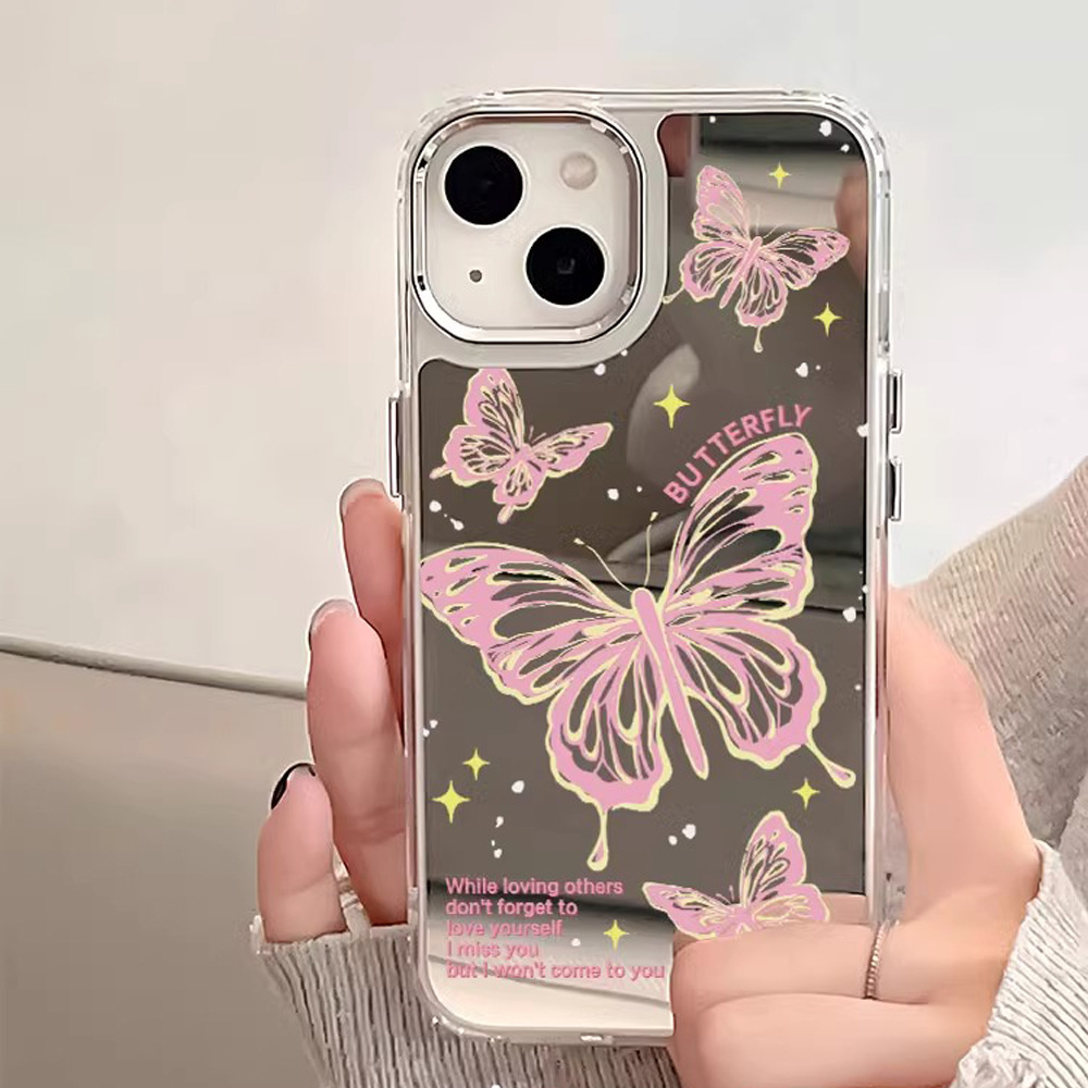 新款日韩ins粉色蝴蝶适用苹果14Pro Max手机壳15镜面iPhone13电镀