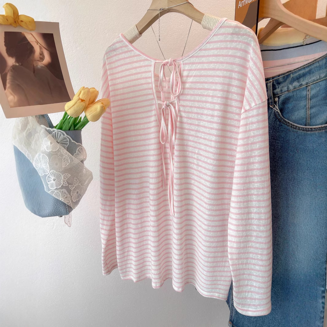粉色条纹吊带外搭上衣女夏长袖t恤薄