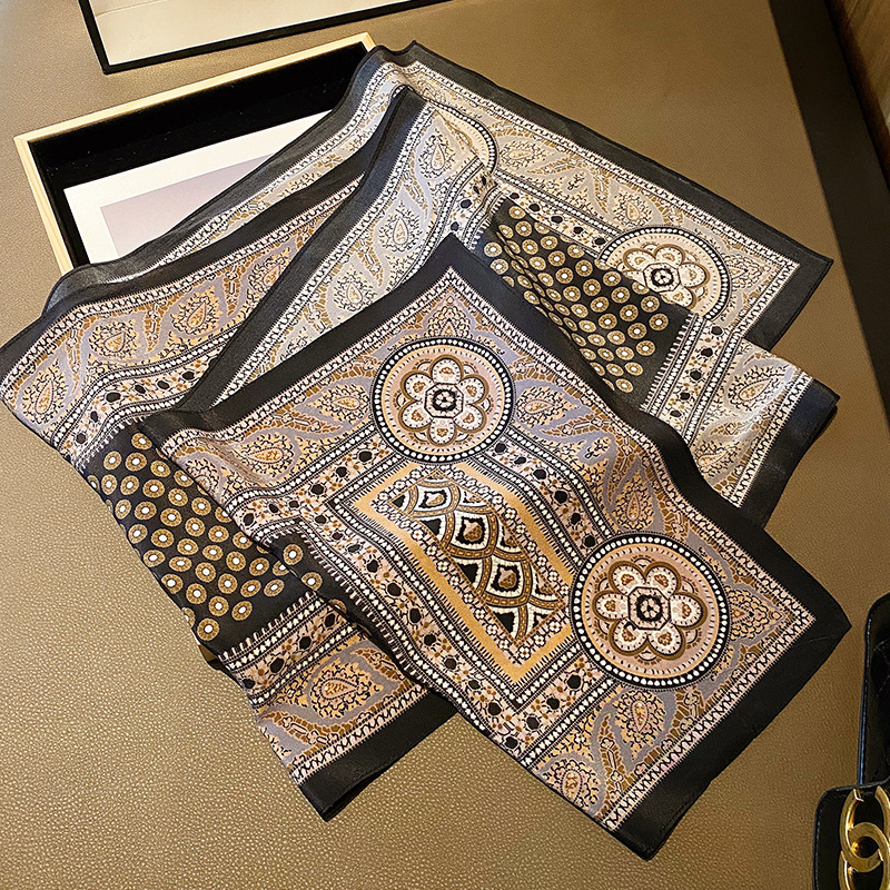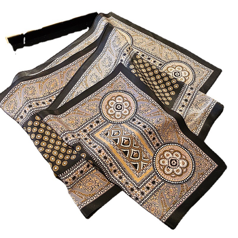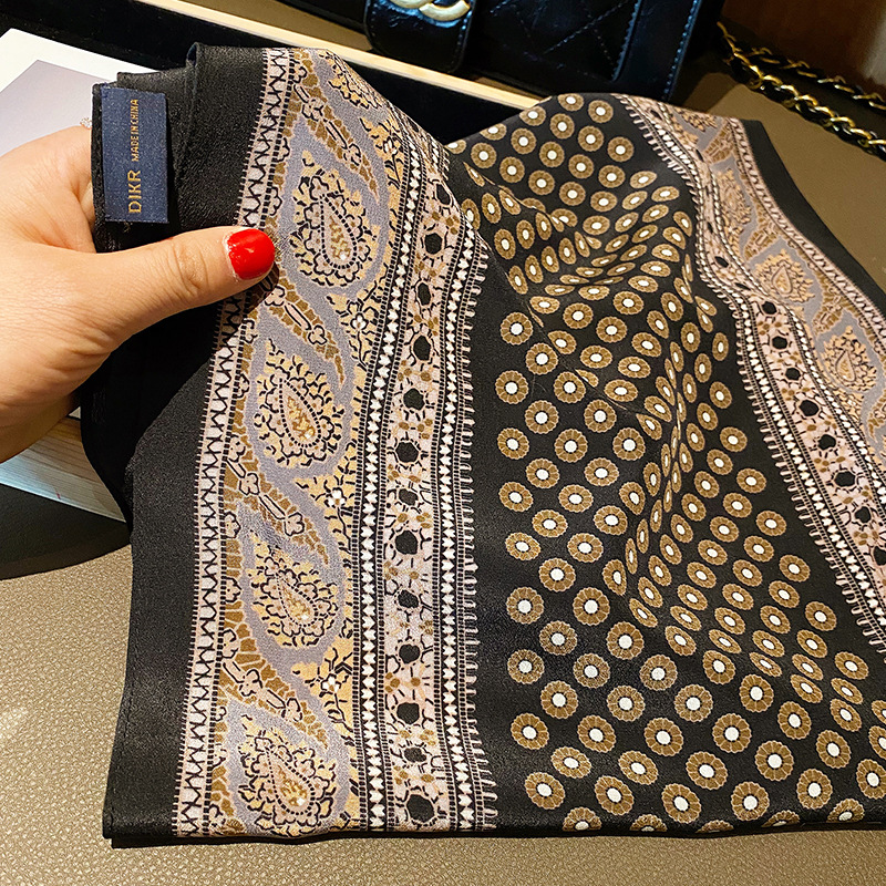 韩系拼接波点印花真丝丝巾 100%桑蚕丝丝巾手工卷边装饰围巾