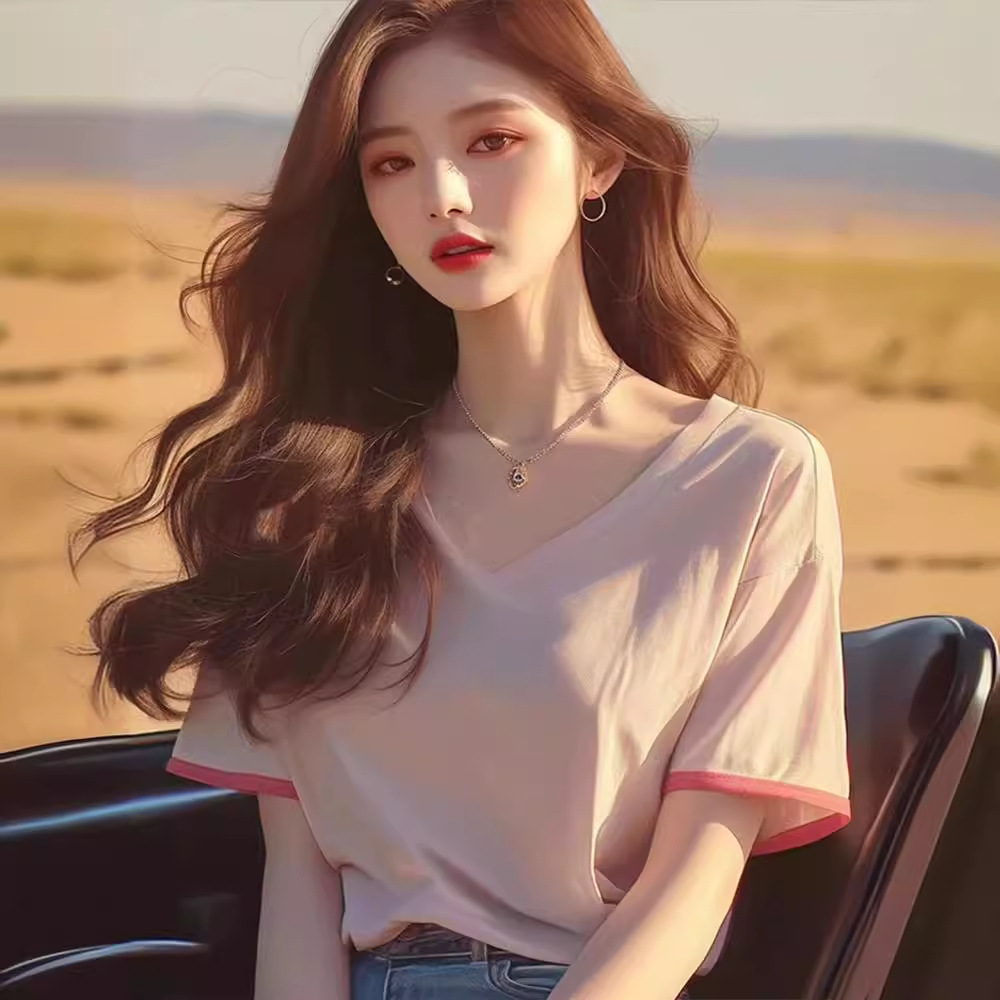 甜辣V领短袖t恤女新款爆款夏季减龄洋气独特别致宽松半袖上衣