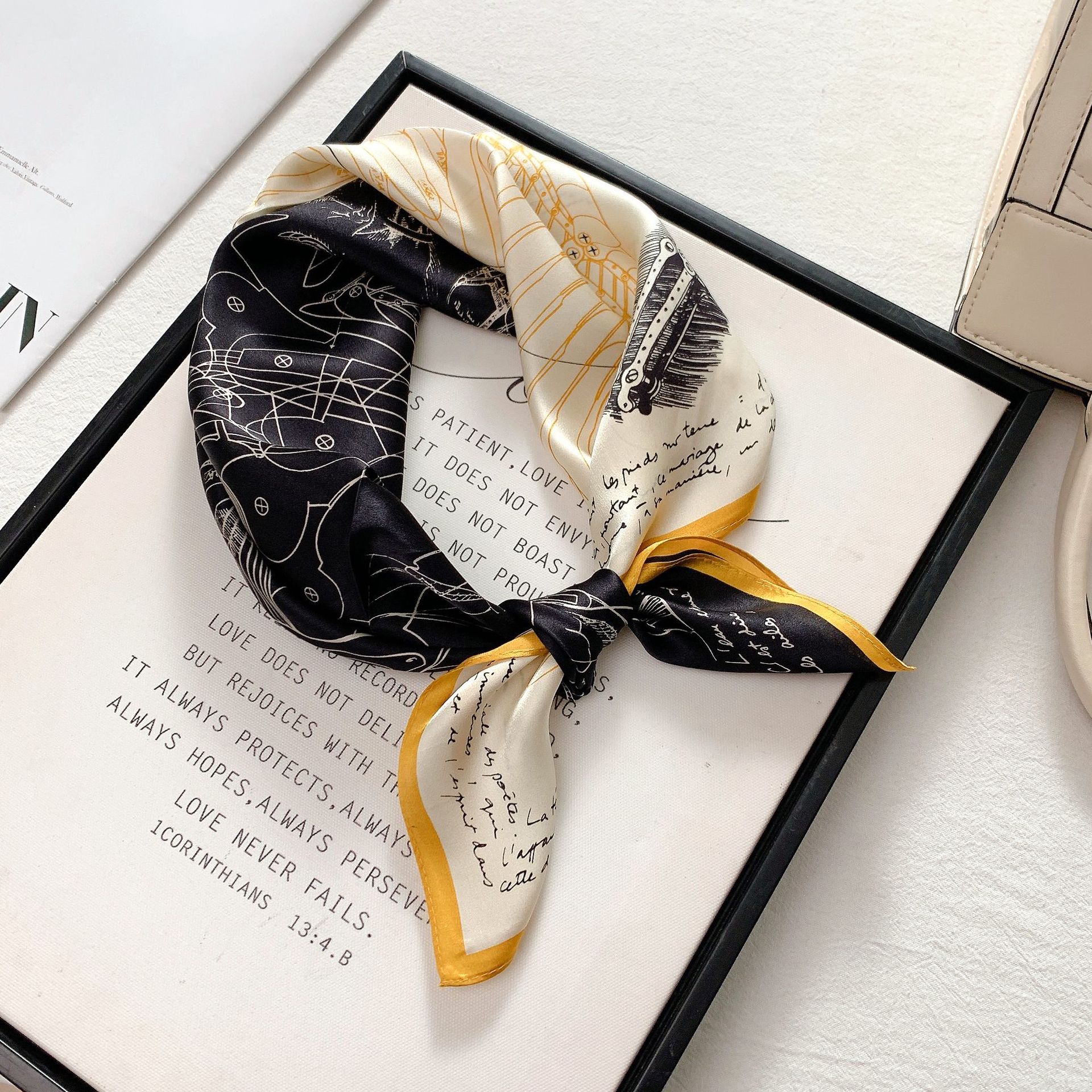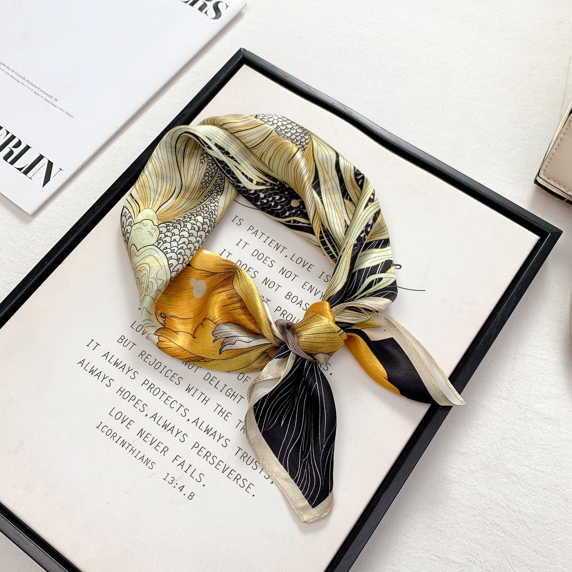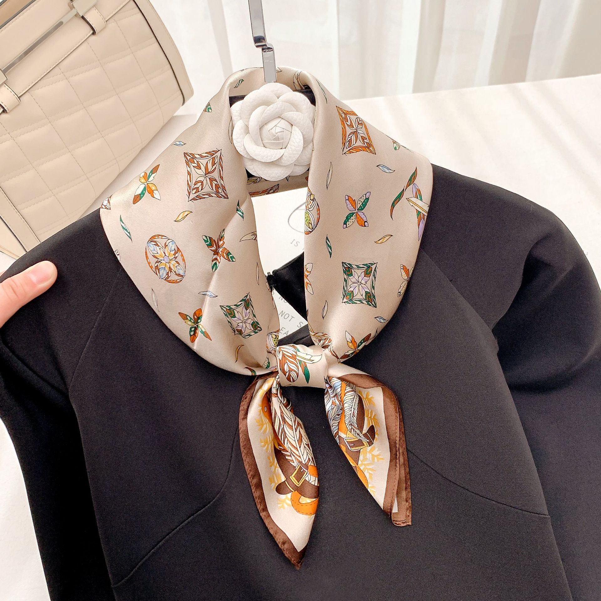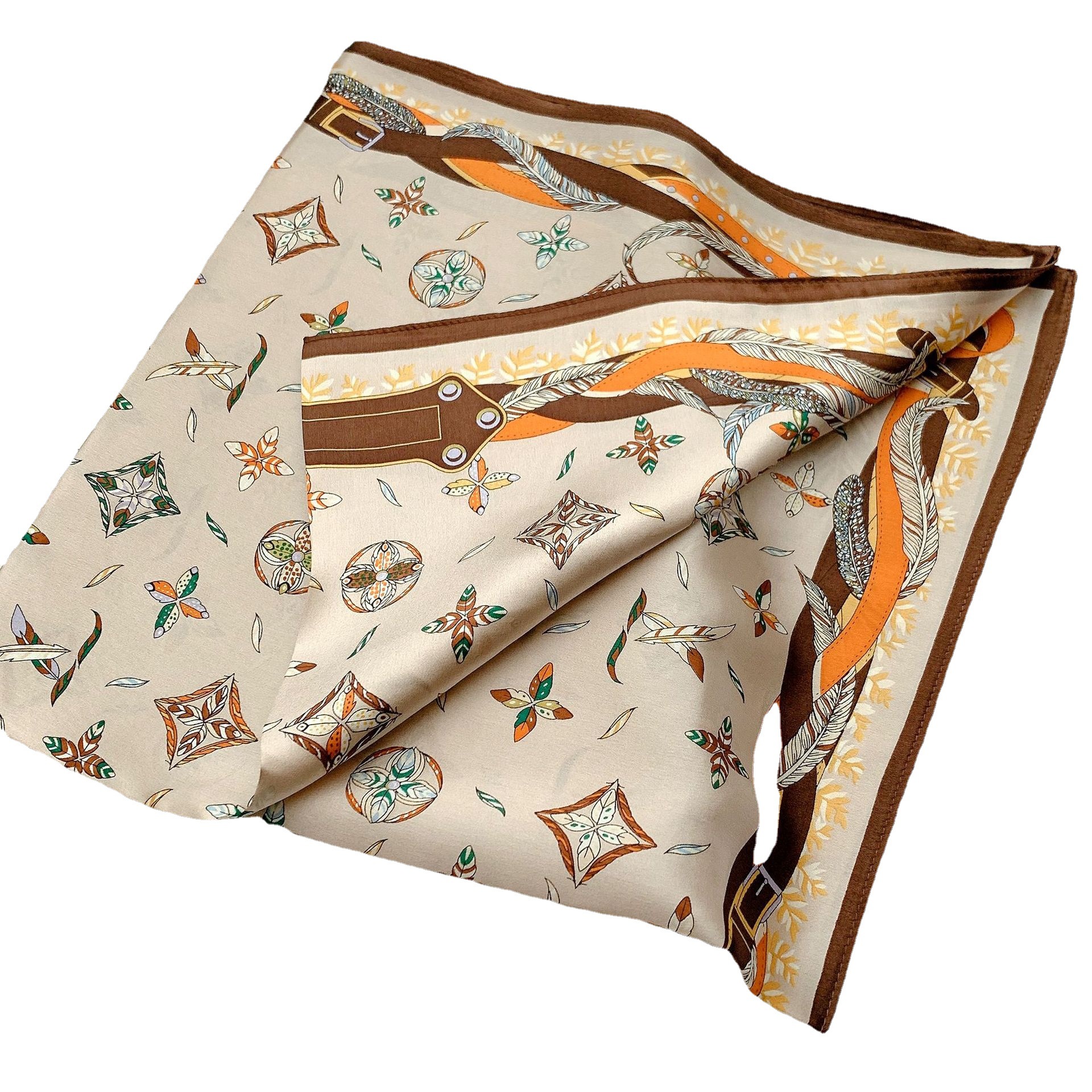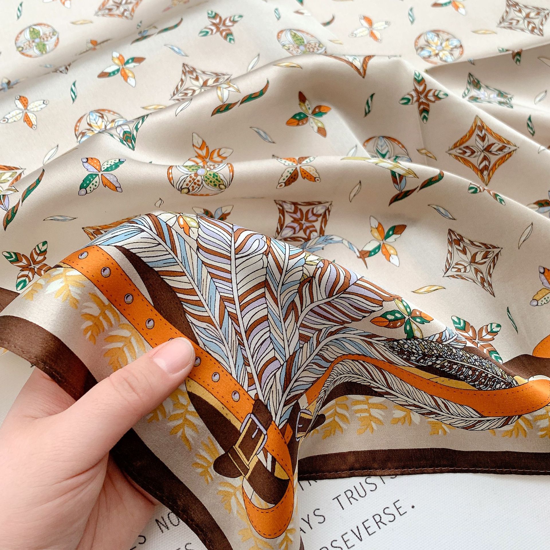 丝绸香槟色羽毛花卉真丝丝巾时尚印花100%桑蚕丝70方巾