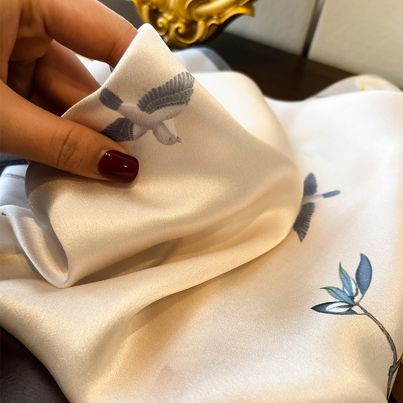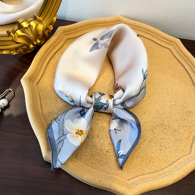 春季时尚迎春花真丝丝巾女百搭优雅高档桑蚕丝丝巾53素绉缎小方巾