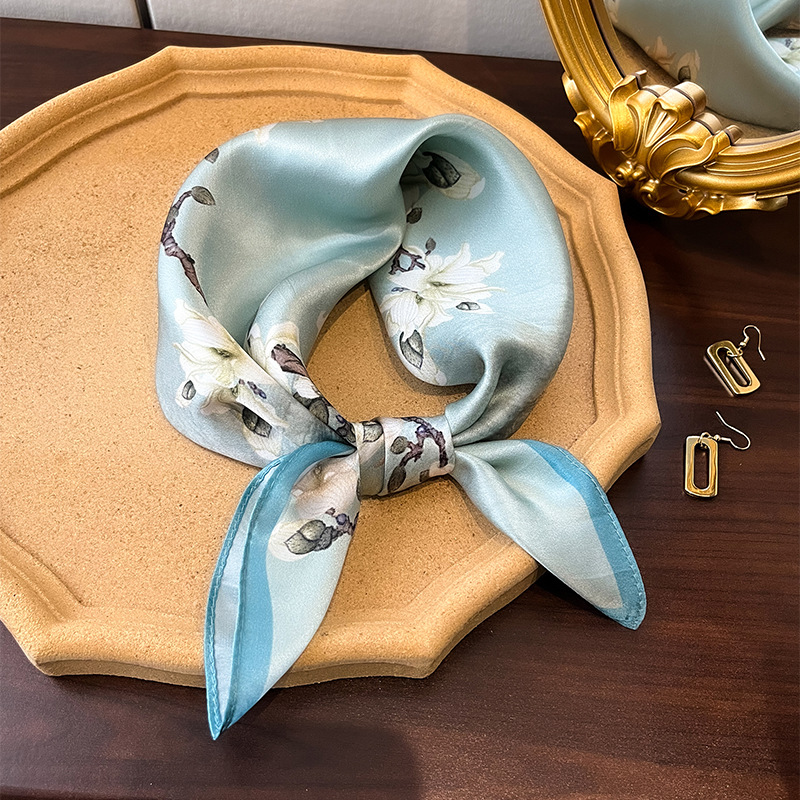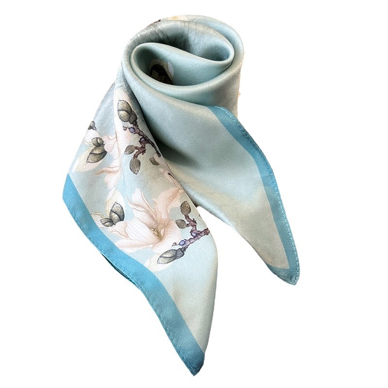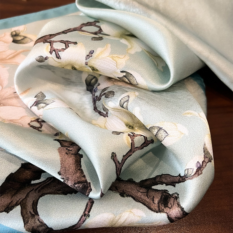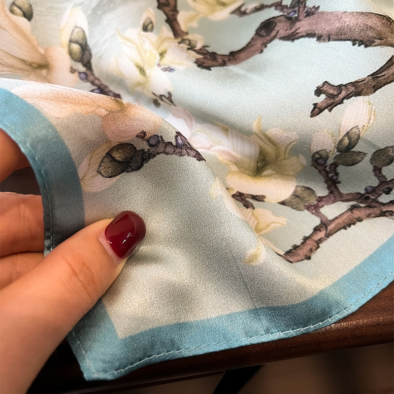 春季优雅玉兰花下真丝丝巾女新款百搭轻奢气质新中式桑蚕丝丝巾