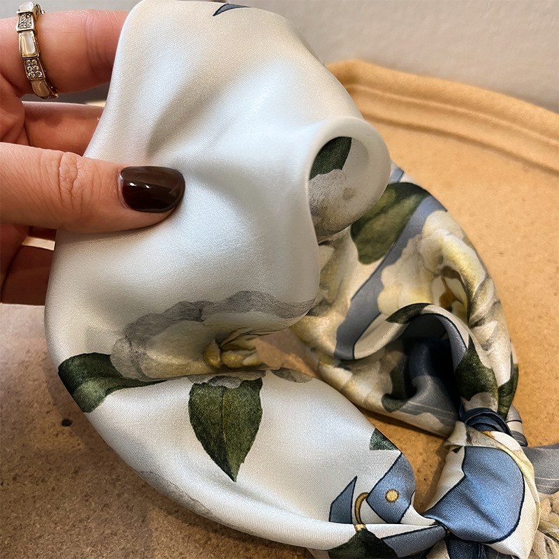 春季真丝丝巾女山茶花时尚优雅100%桑蚕丝丝巾53百搭小方巾