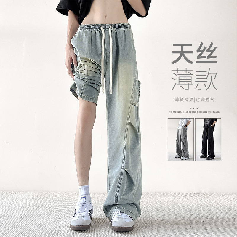 冰丝牛仔裤男秋季薄款凉感褶皱工装裤美式高街宽松直筒松