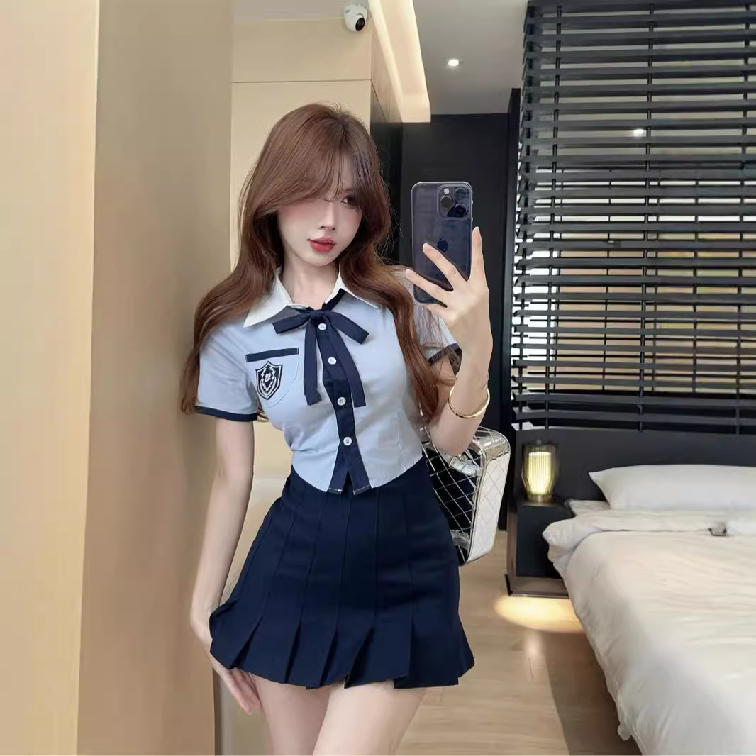 夏季新款韩系设计感短袖衬衫甜辣妹学院风制服百褶短裙两件套装女
