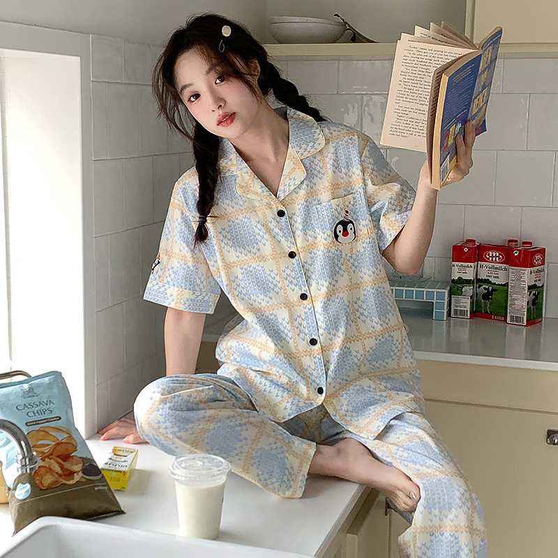 韩版企鹅刺绣口袋短袖长裤纯棉睡衣两件套简约清新翻领家居服套装