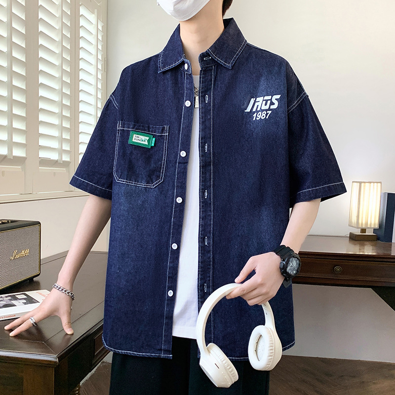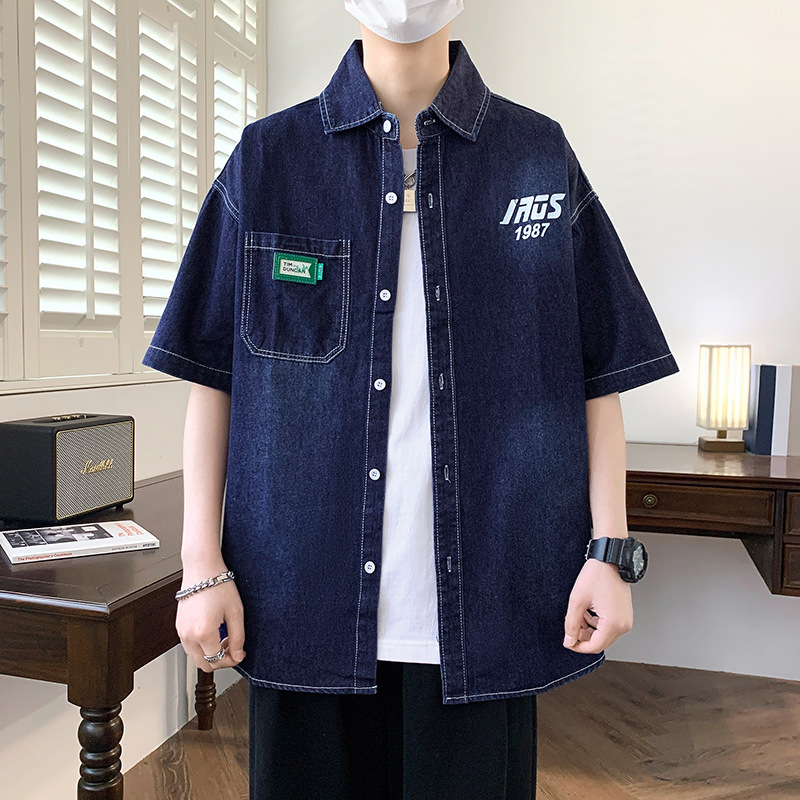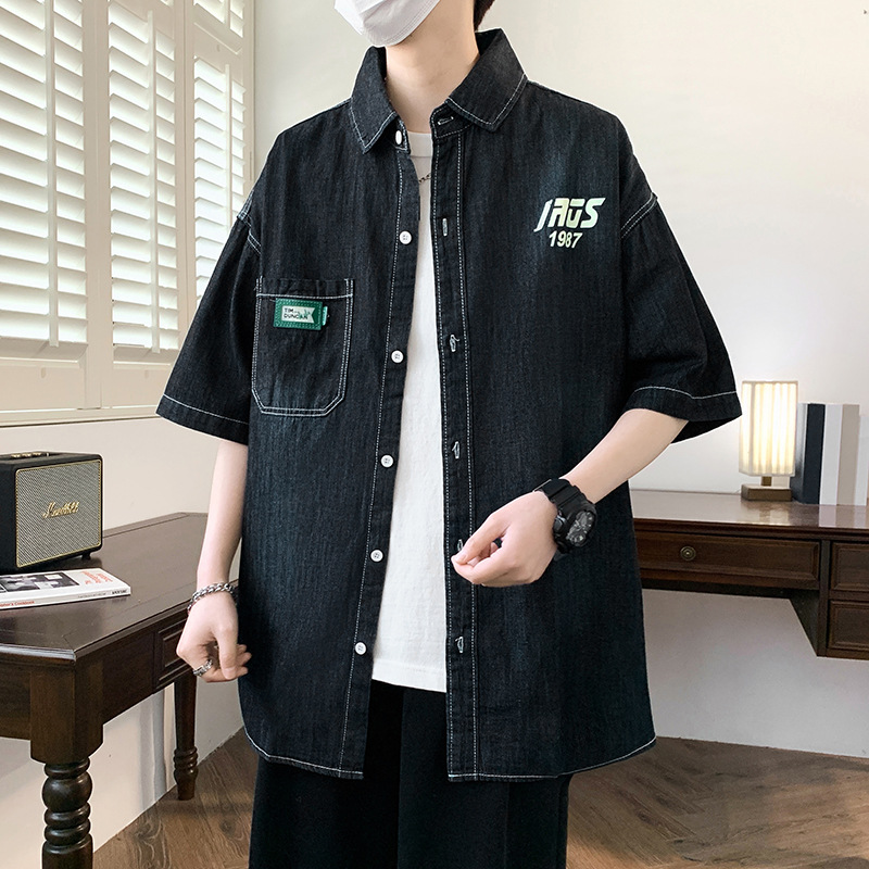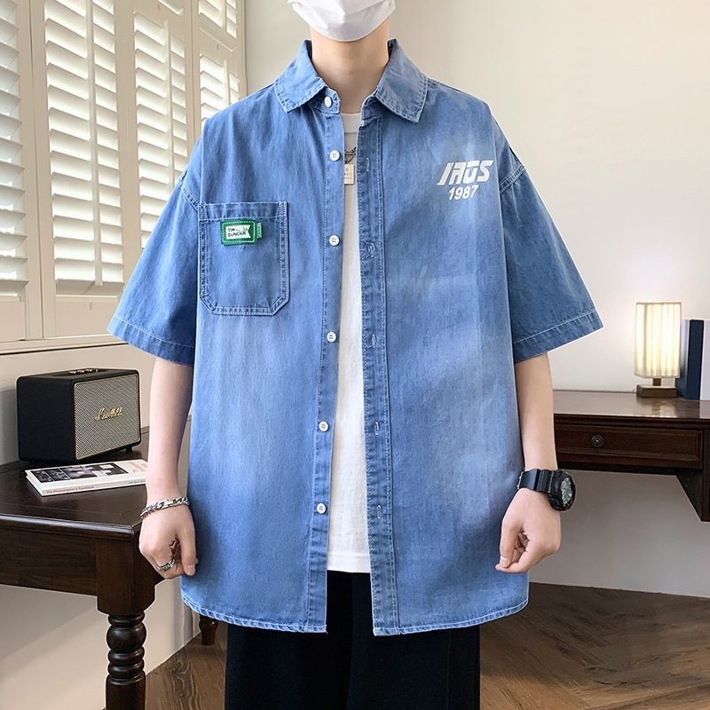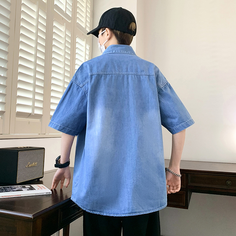 短袖牛仔衬衫男夏季美式潮牌痞帅宽松慵懒风情侣男装半袖寸衫外套