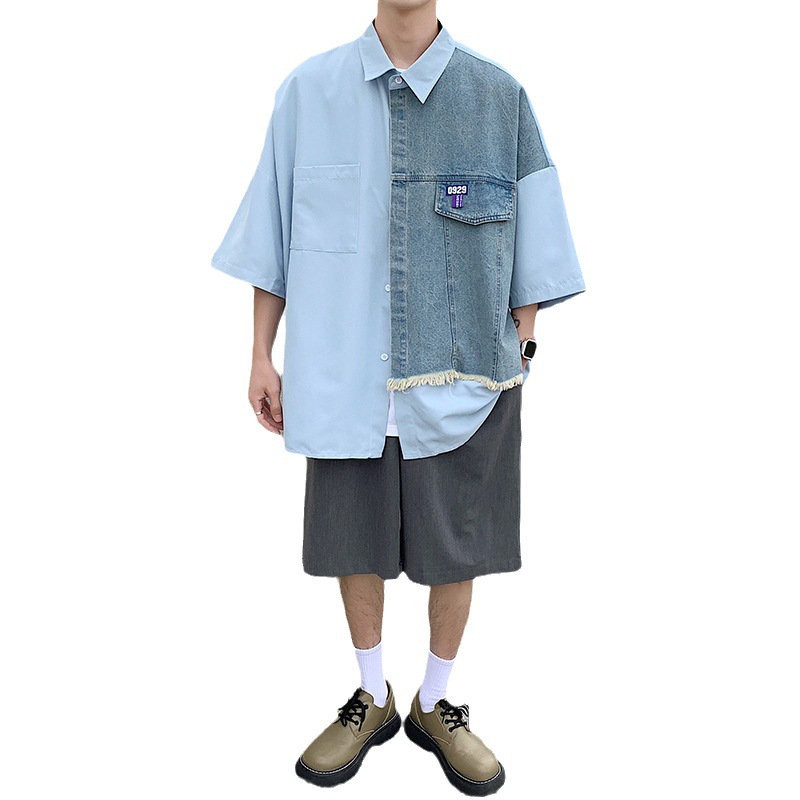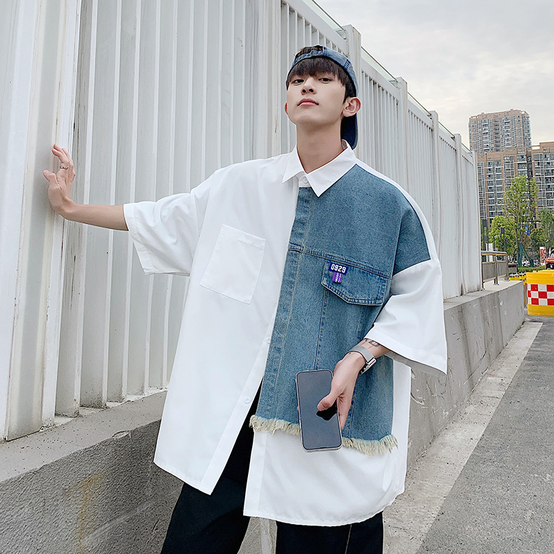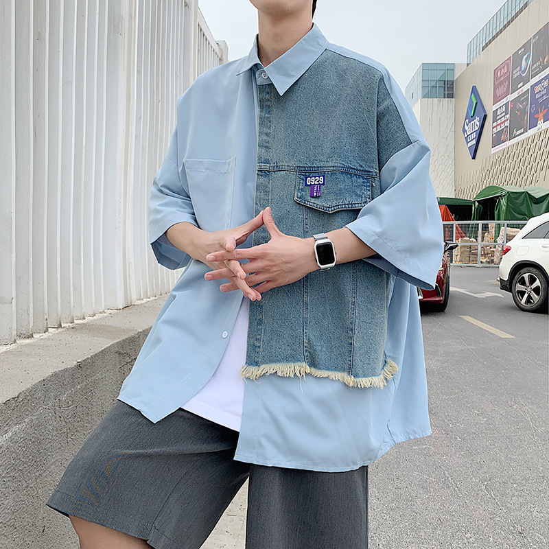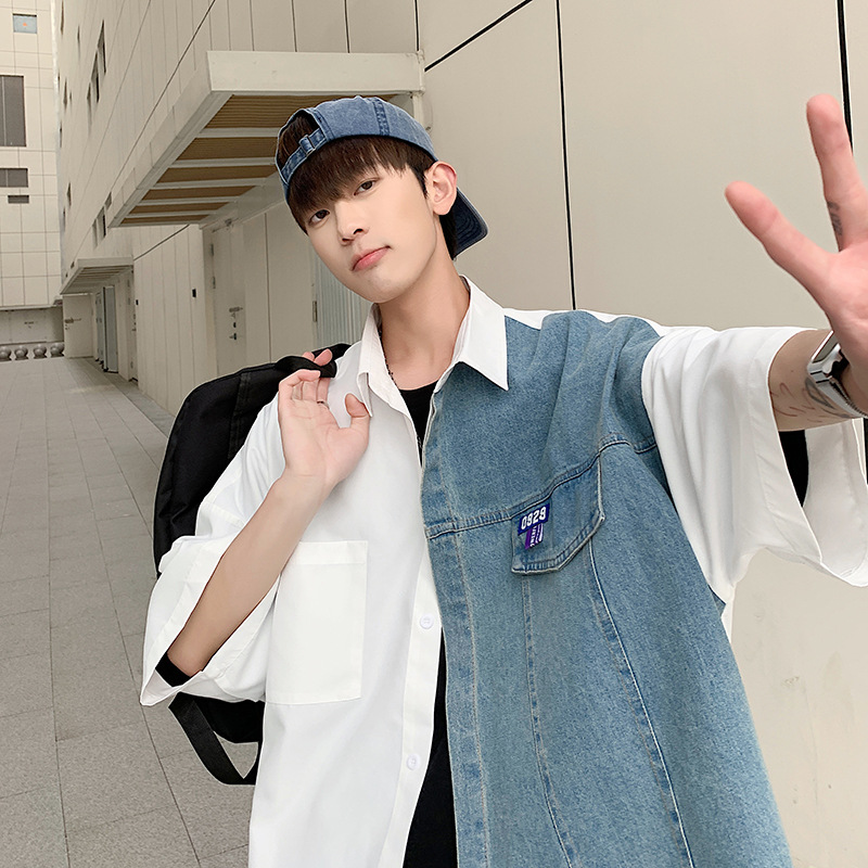 夏装新款宽松翻领短袖衬衫男士假两件拼接港风牛仔衬衣男上衣