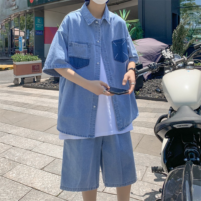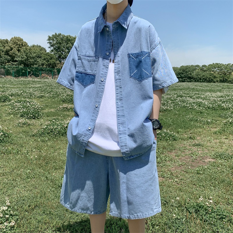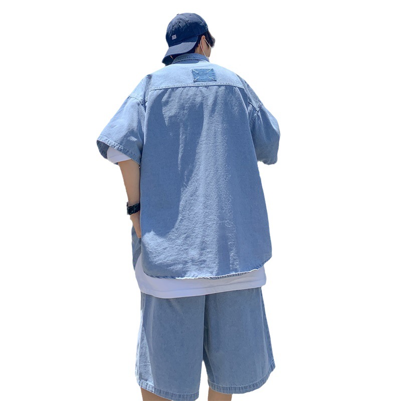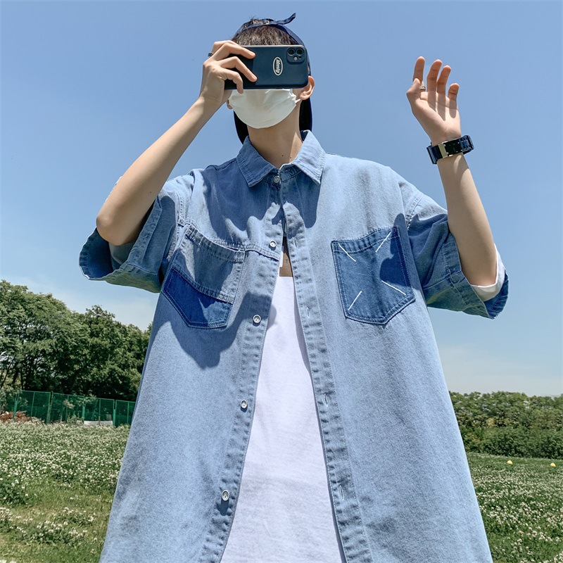 牛仔衬衫男士夏季薄款短袖衬衣男款痞帅五分袖工装休闲外套男生潮