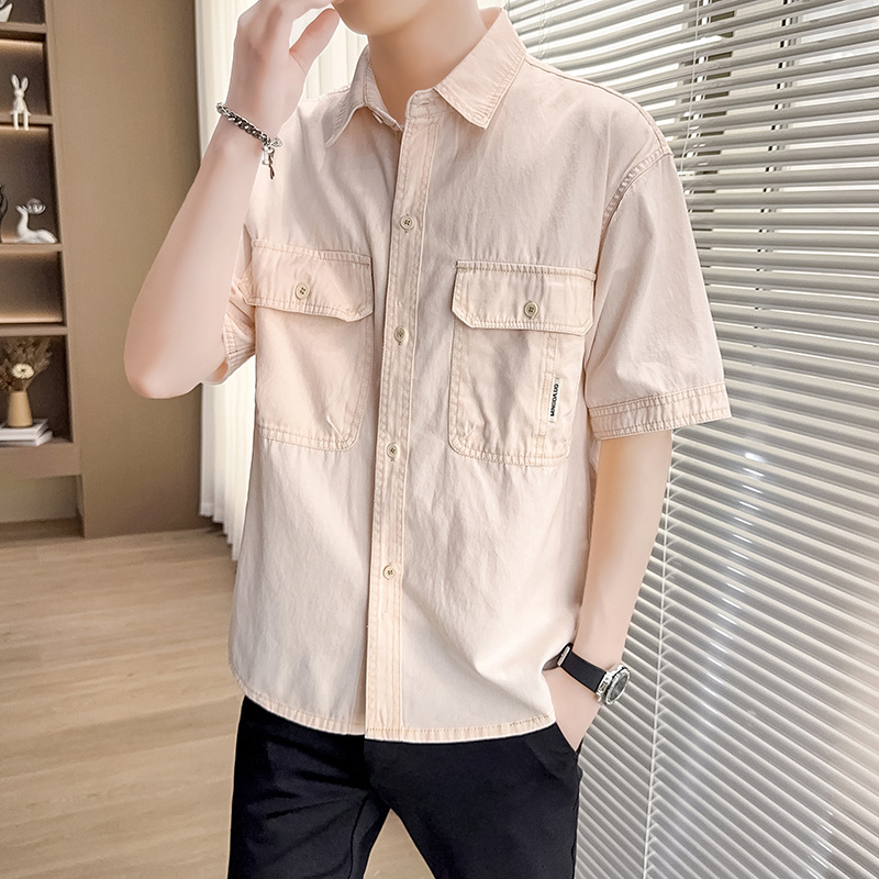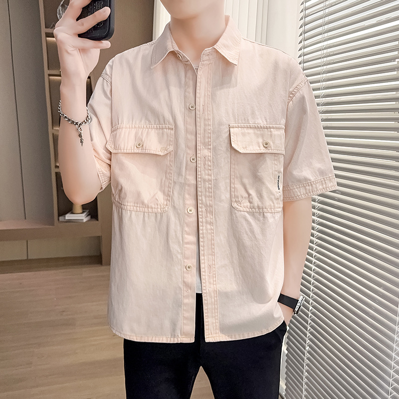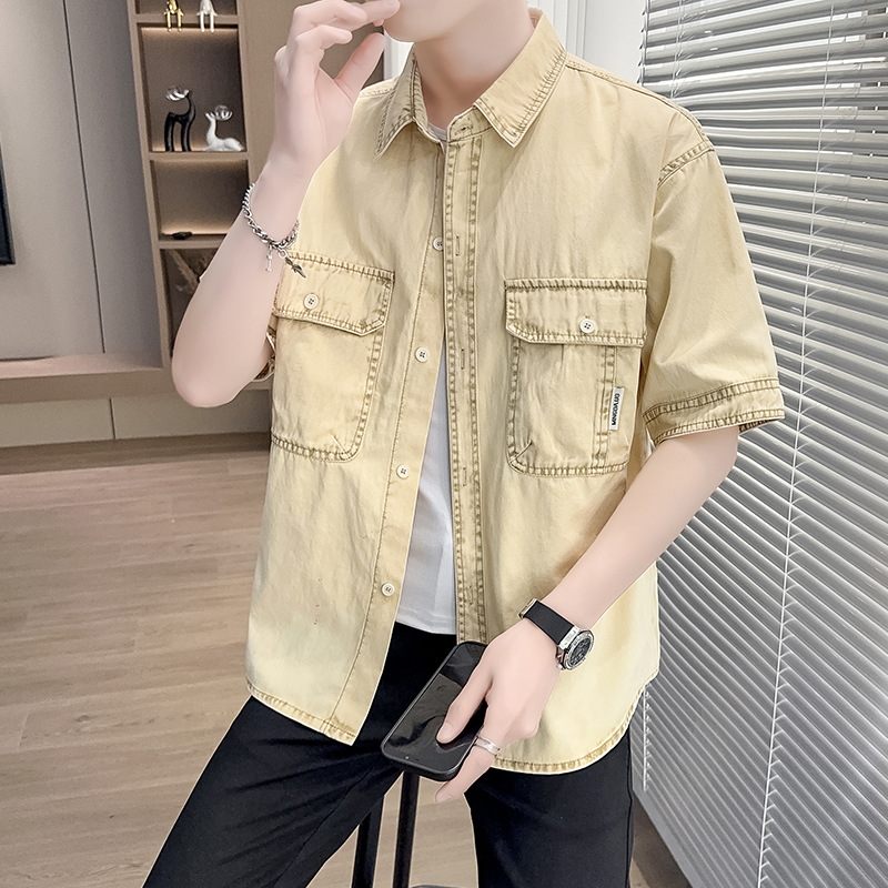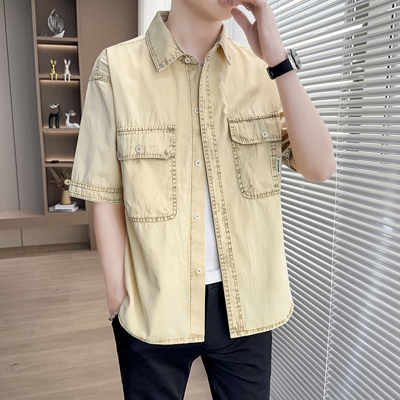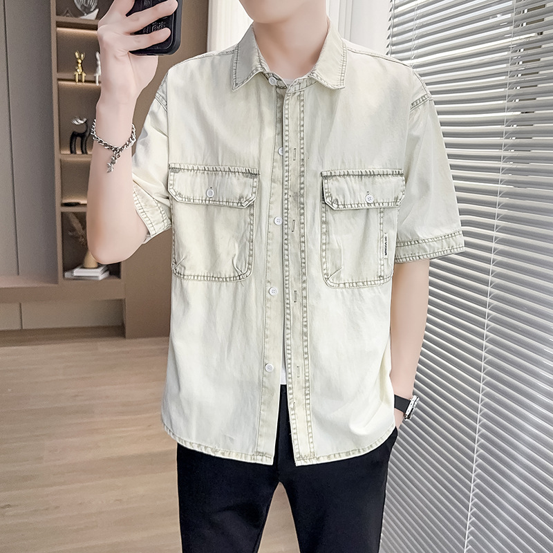 短袖衬衫男水洗牛仔夏季休闲宽松薄款衬衣潮流帅气韩版男装