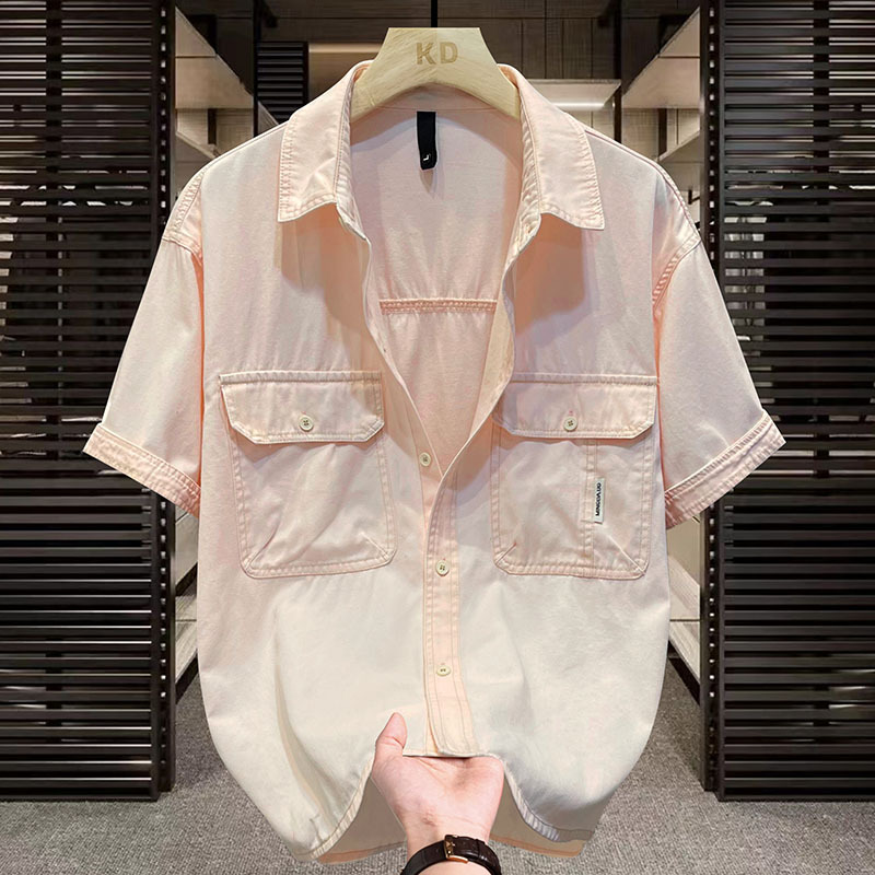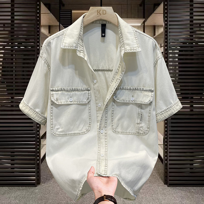 夏季薄款短袖牛仔衬衫男士潮流纯棉水洗工装翻领宽松衬衣休闲