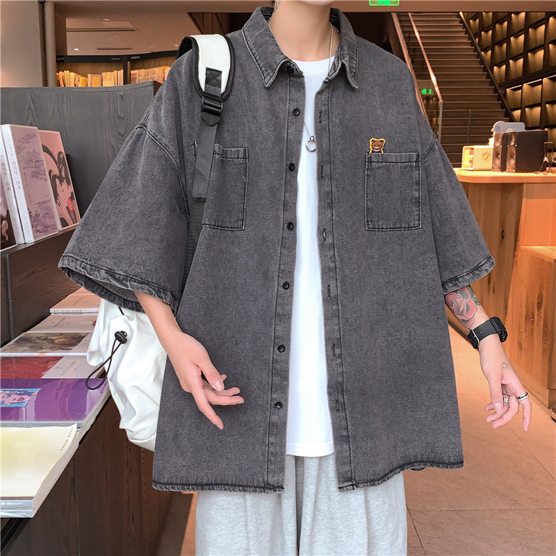 日系牛仔衬衫男士夏季新款青少年小清新百搭oversize短袖外套