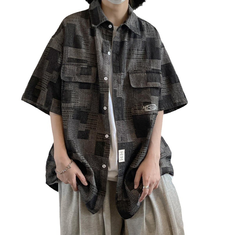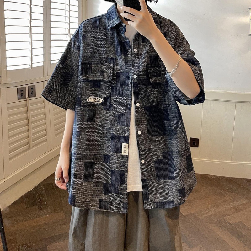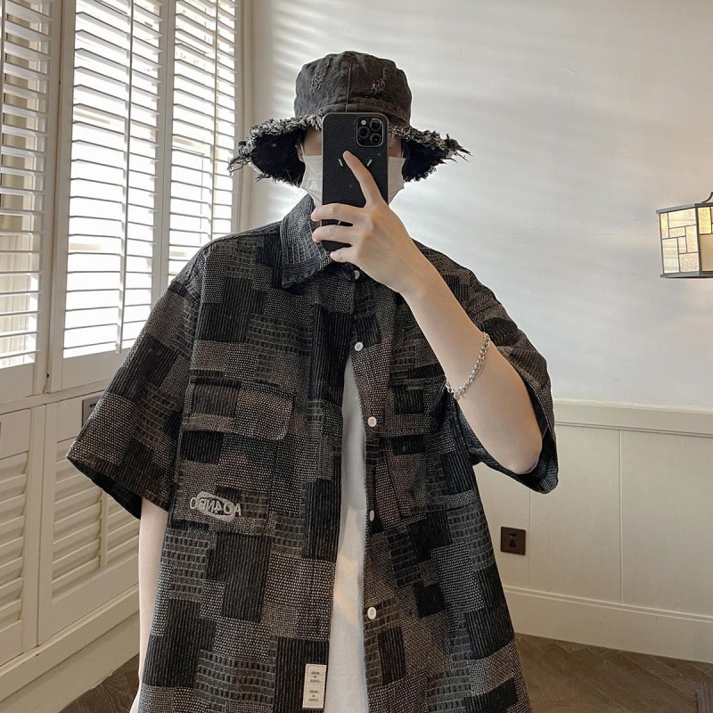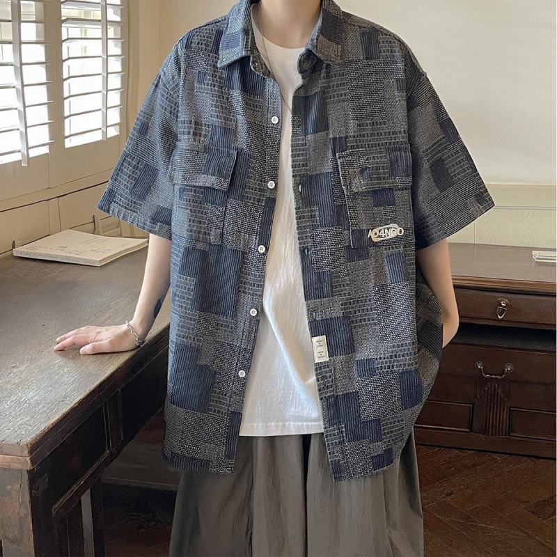 夏季牛仔短袖衬衫男潮牌宽松复古五分袖ins港风休闲格子衬衣外套