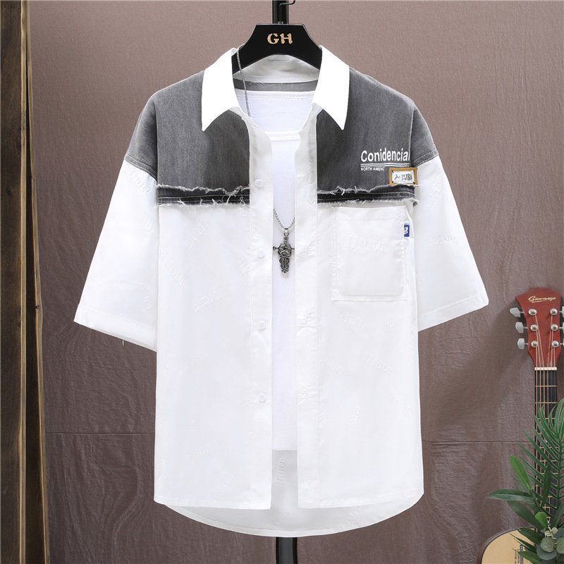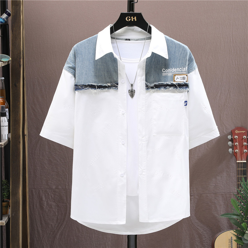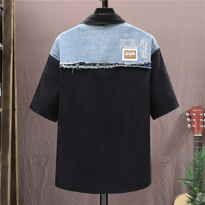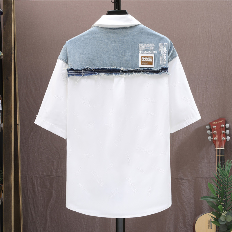 夏季牛仔拼接假两件上衣翻领衬衫男短袖宽松百搭衬衫运动
