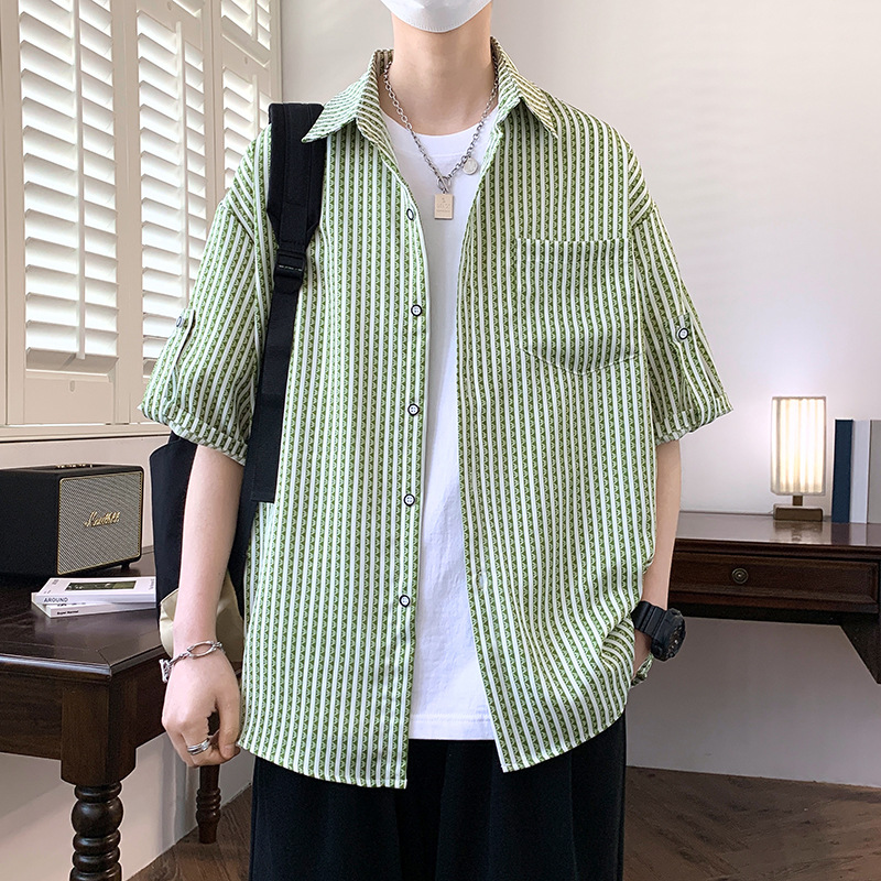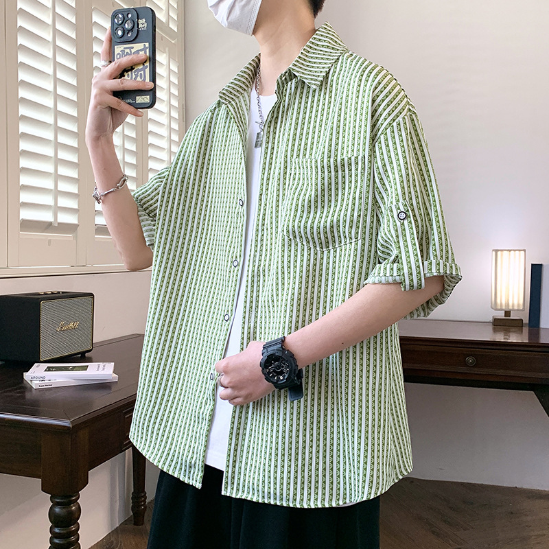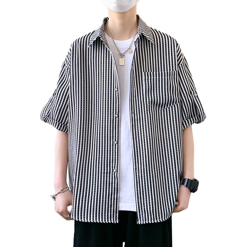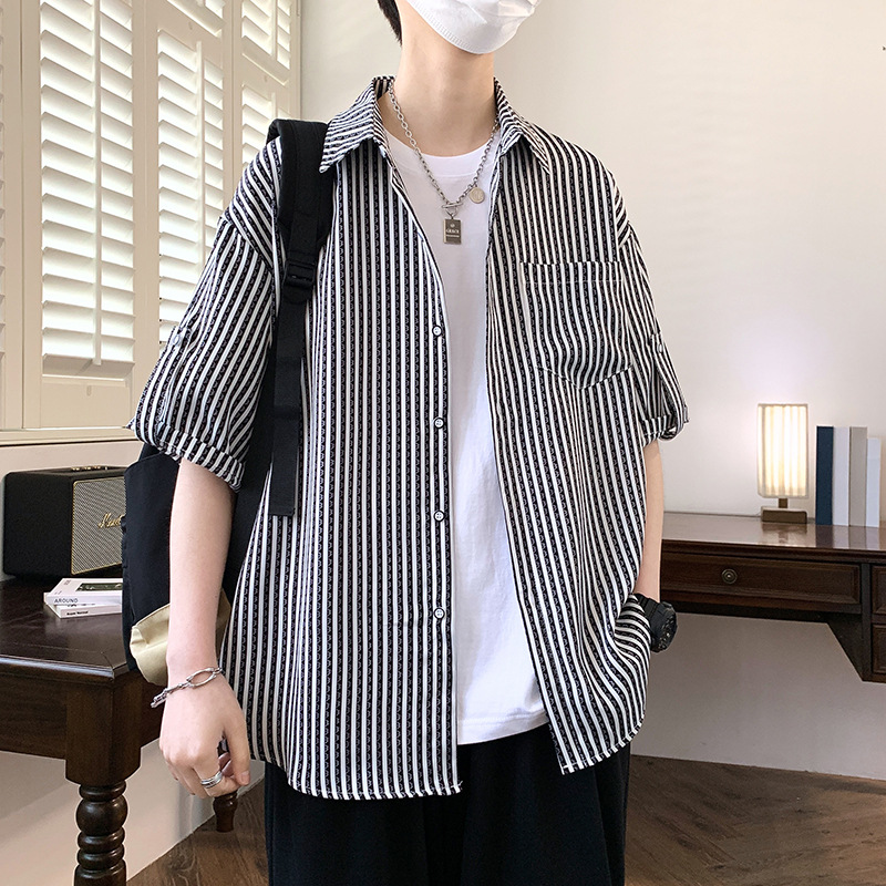 夏季经典竖条纹短袖衬衫男沙滩休闲度假男衬衣潮流发型师痞帅