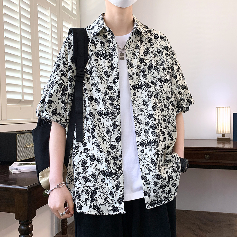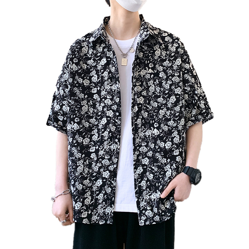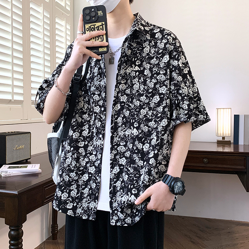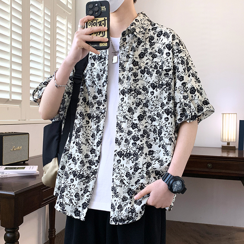 夏季君子梅花短袖衬衫男沙滩休闲度假男衬衣潮流发型师痞帅
