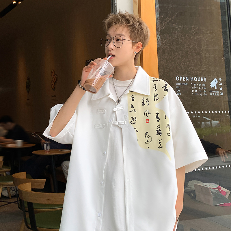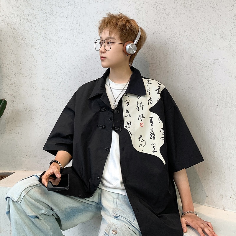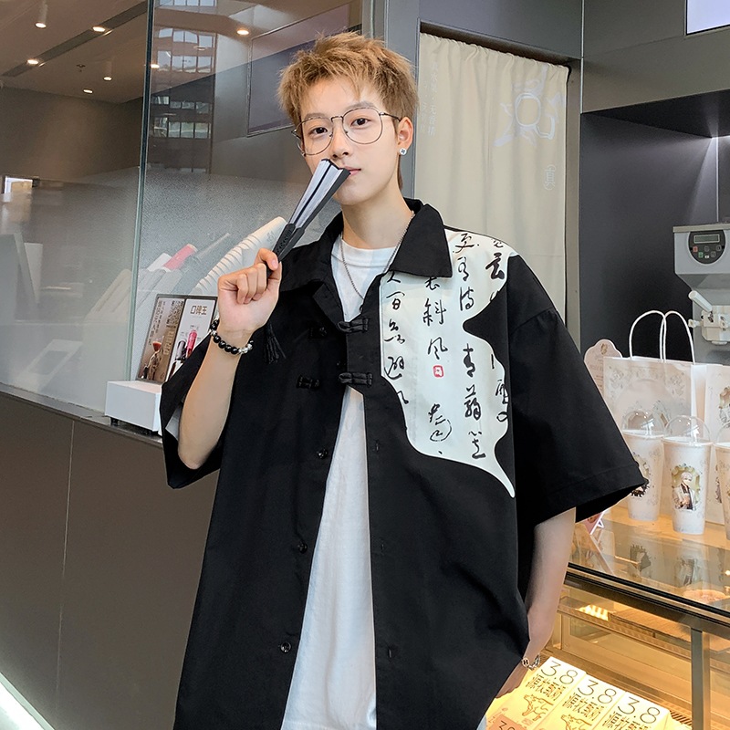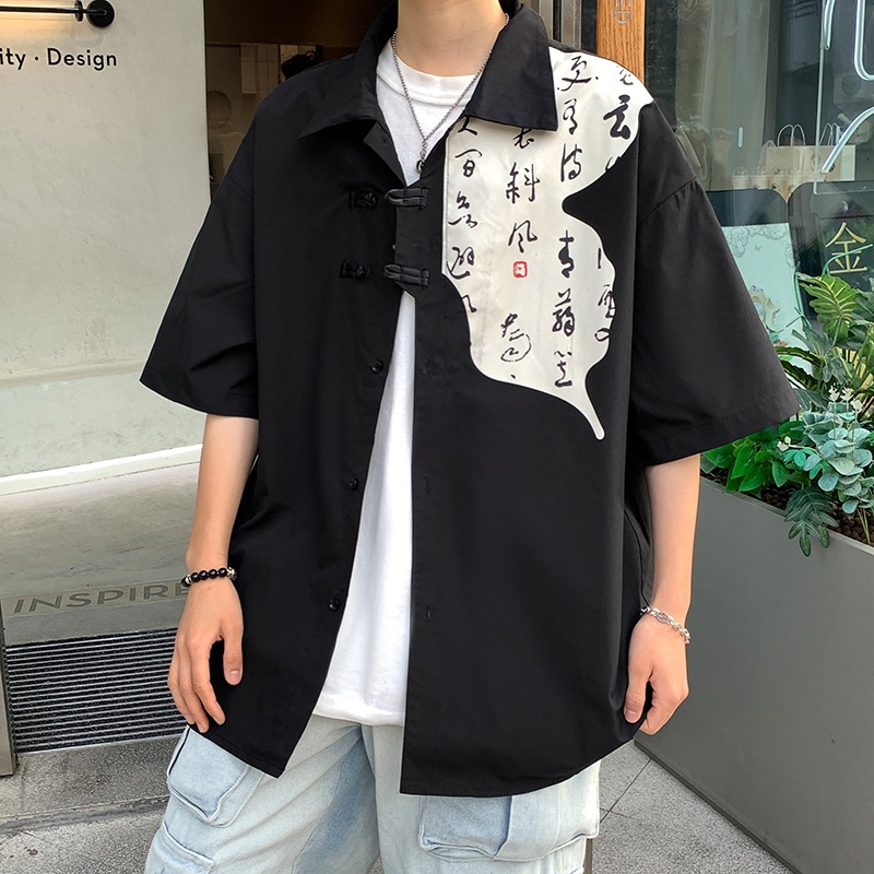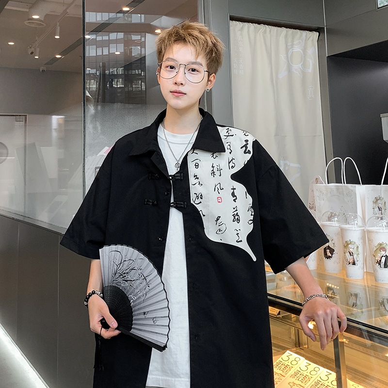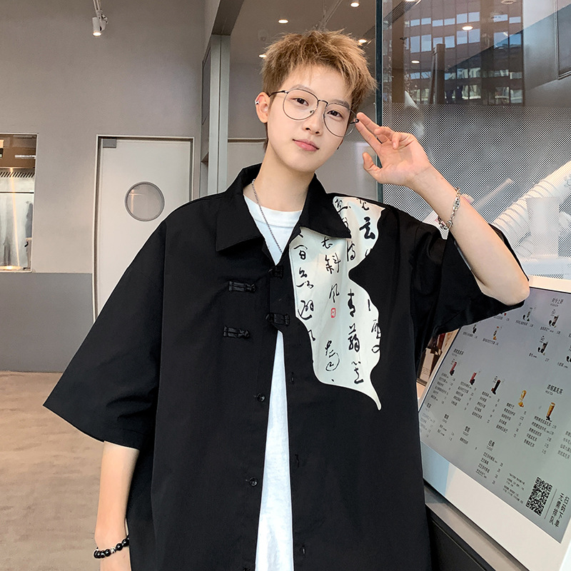 夏装潮男新中式甲骨文印花盘扣短袖五分袖衬衫