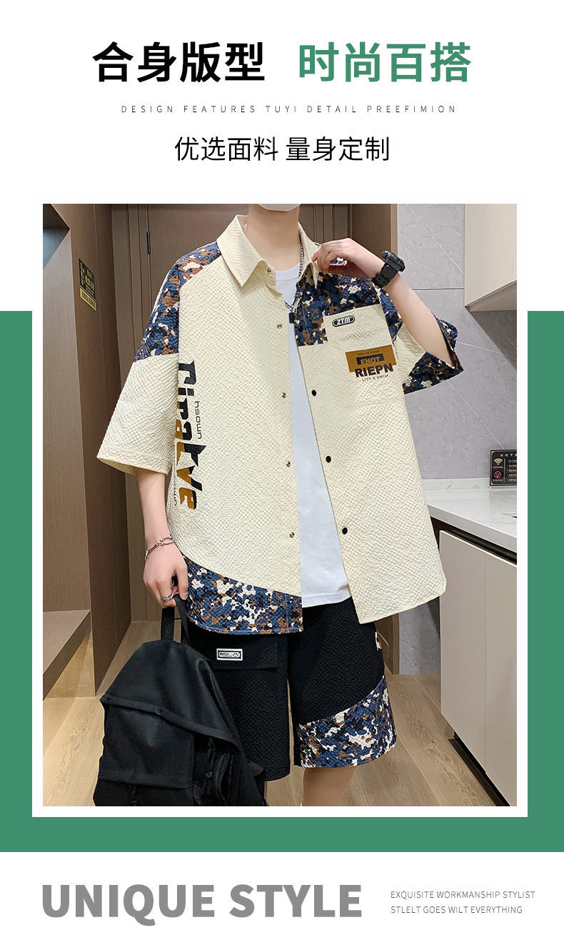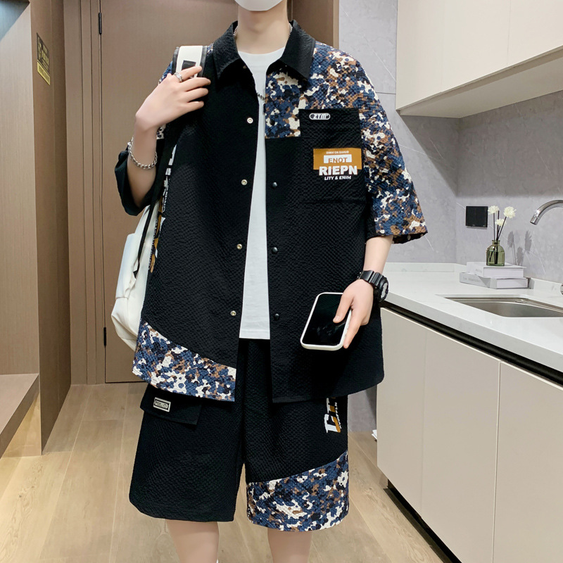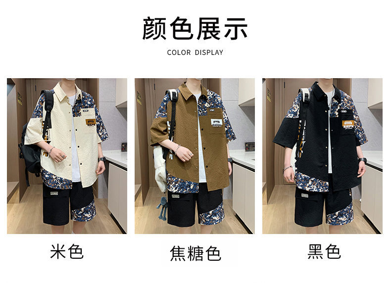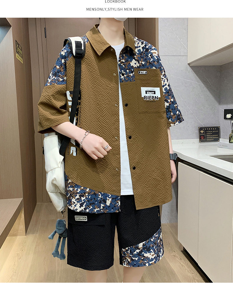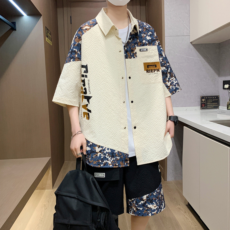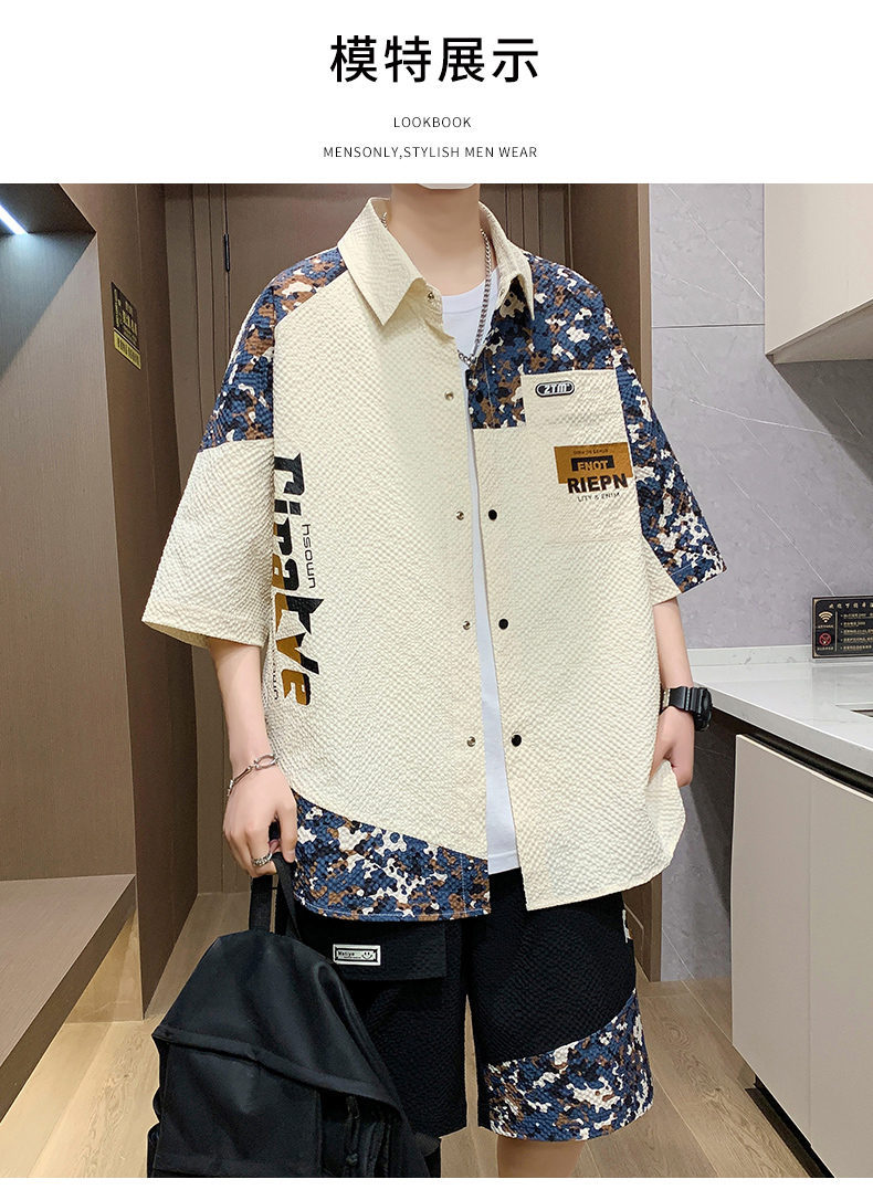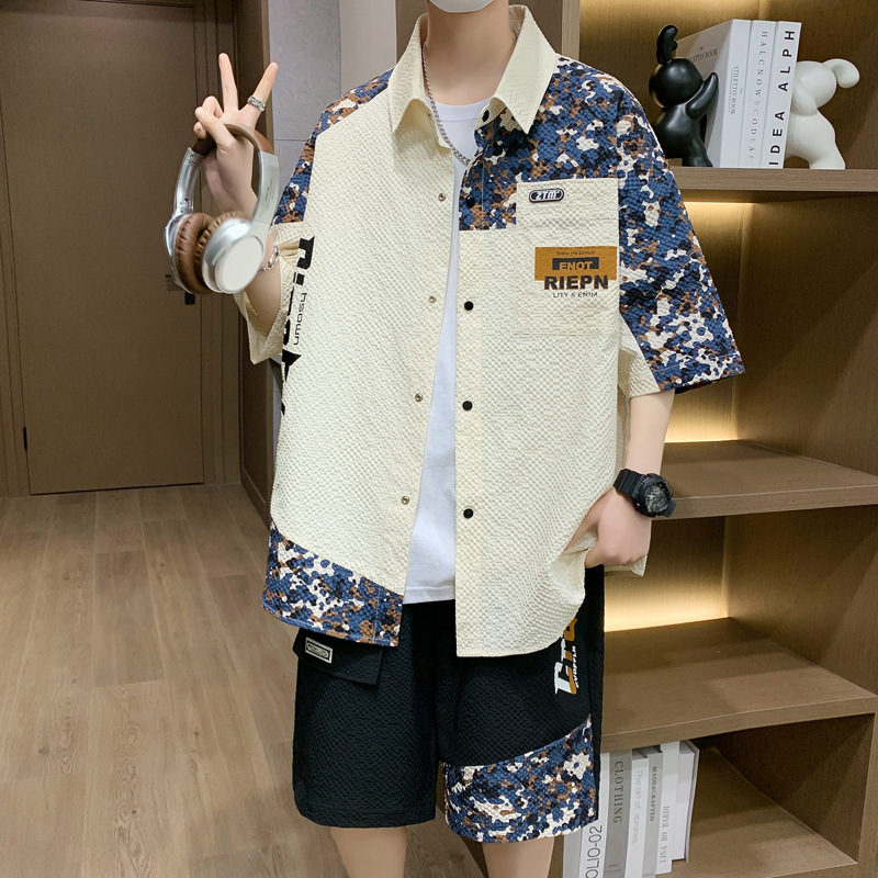 夏季港风衬衣套装青少年时尚潮流百搭衬衫短袖短裤套装男