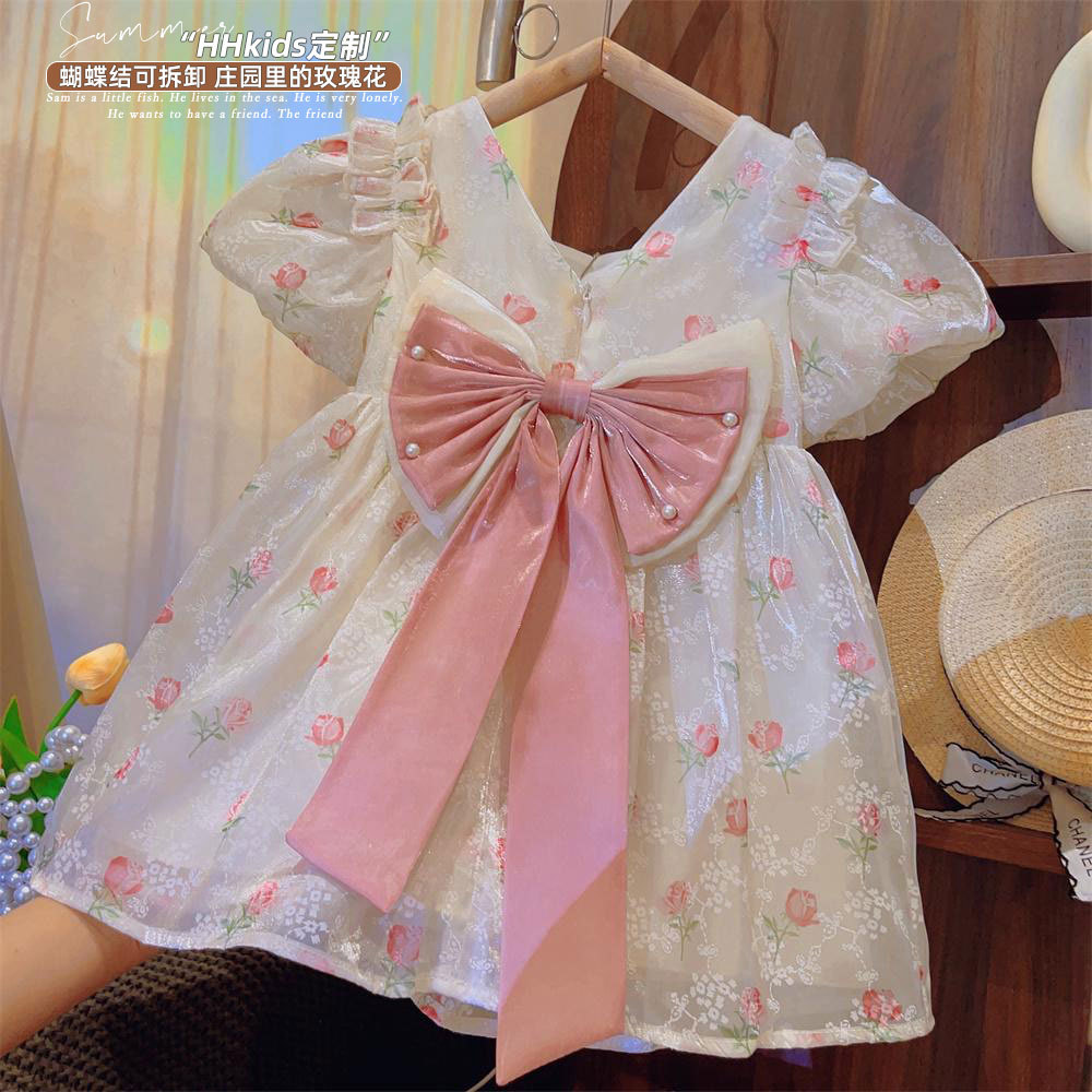 新品女童玫瑰提花亮片大方领泡泡短袖公主仙女裙2025夏装连衣裙