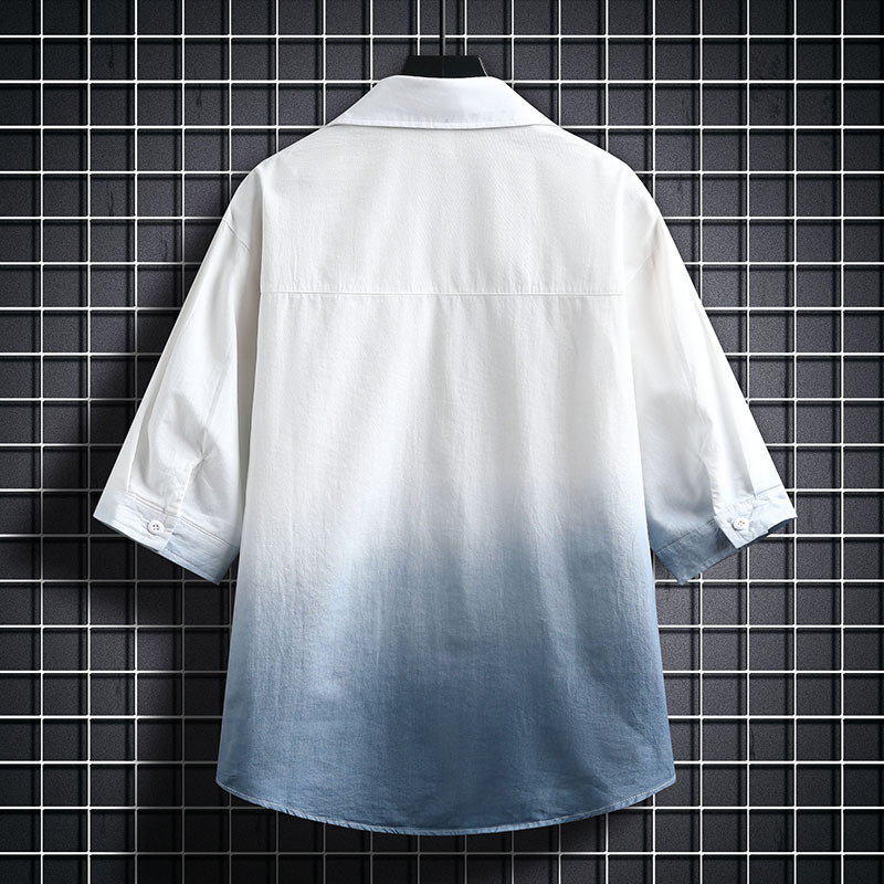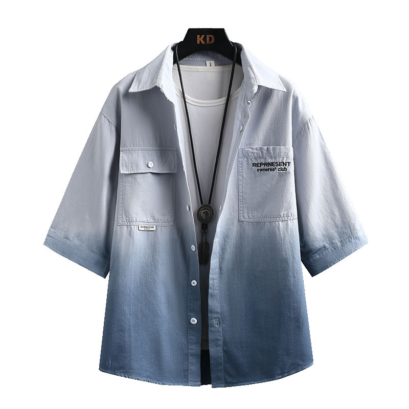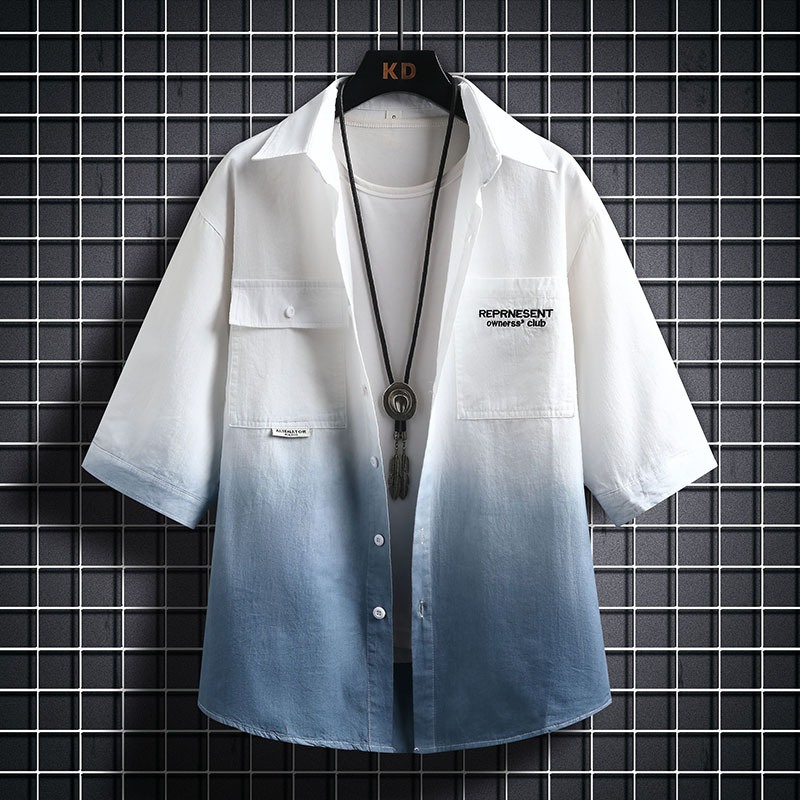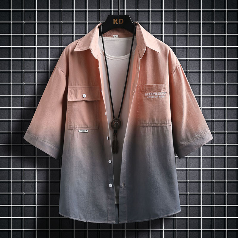 青少年中袖衬衫男浅变色贴布夏季男宽松五分袖中学生帅气上衣