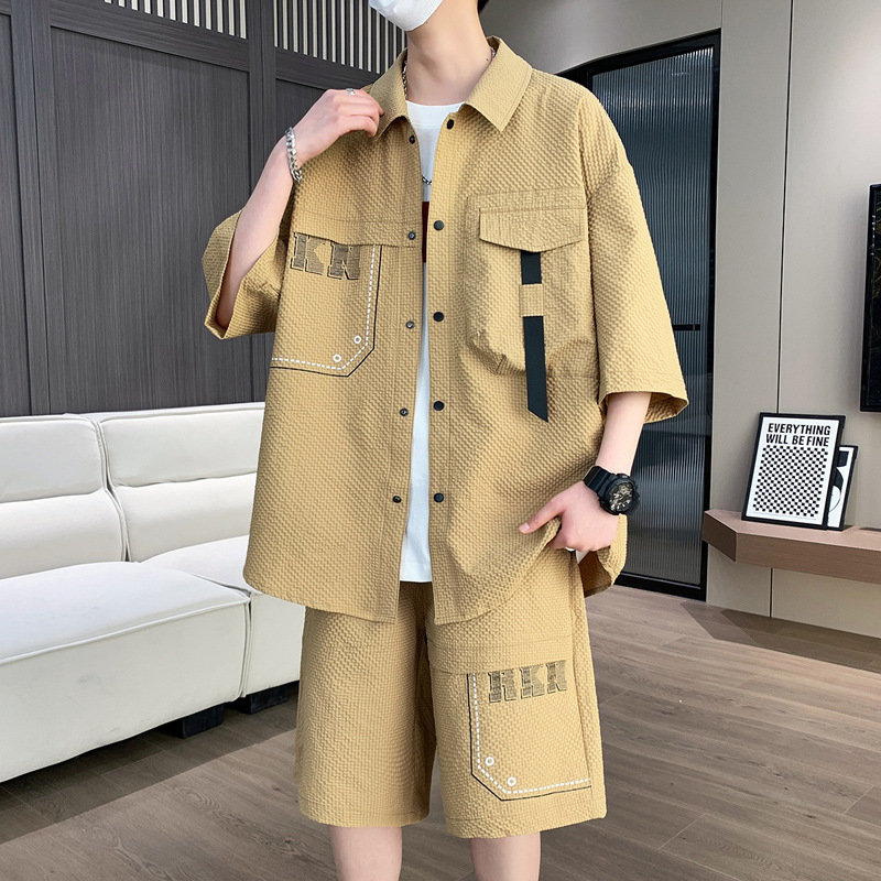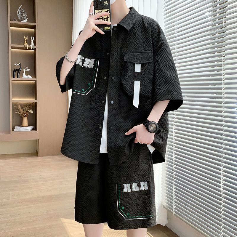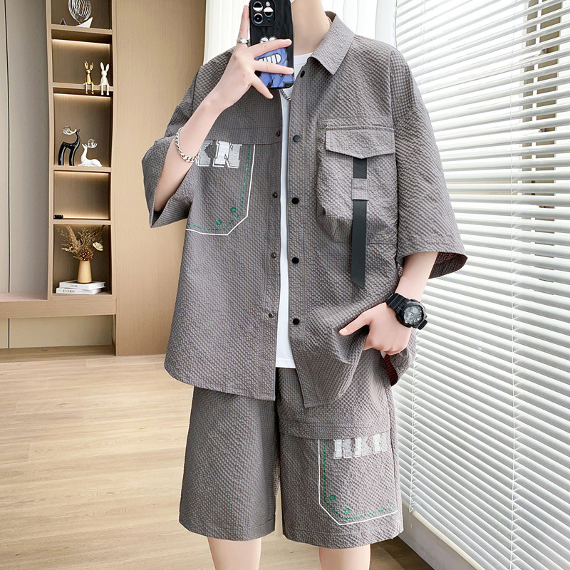 夏季新款短袖衬衫男士舒适套装港风青少年休闲宽松短裤套装男